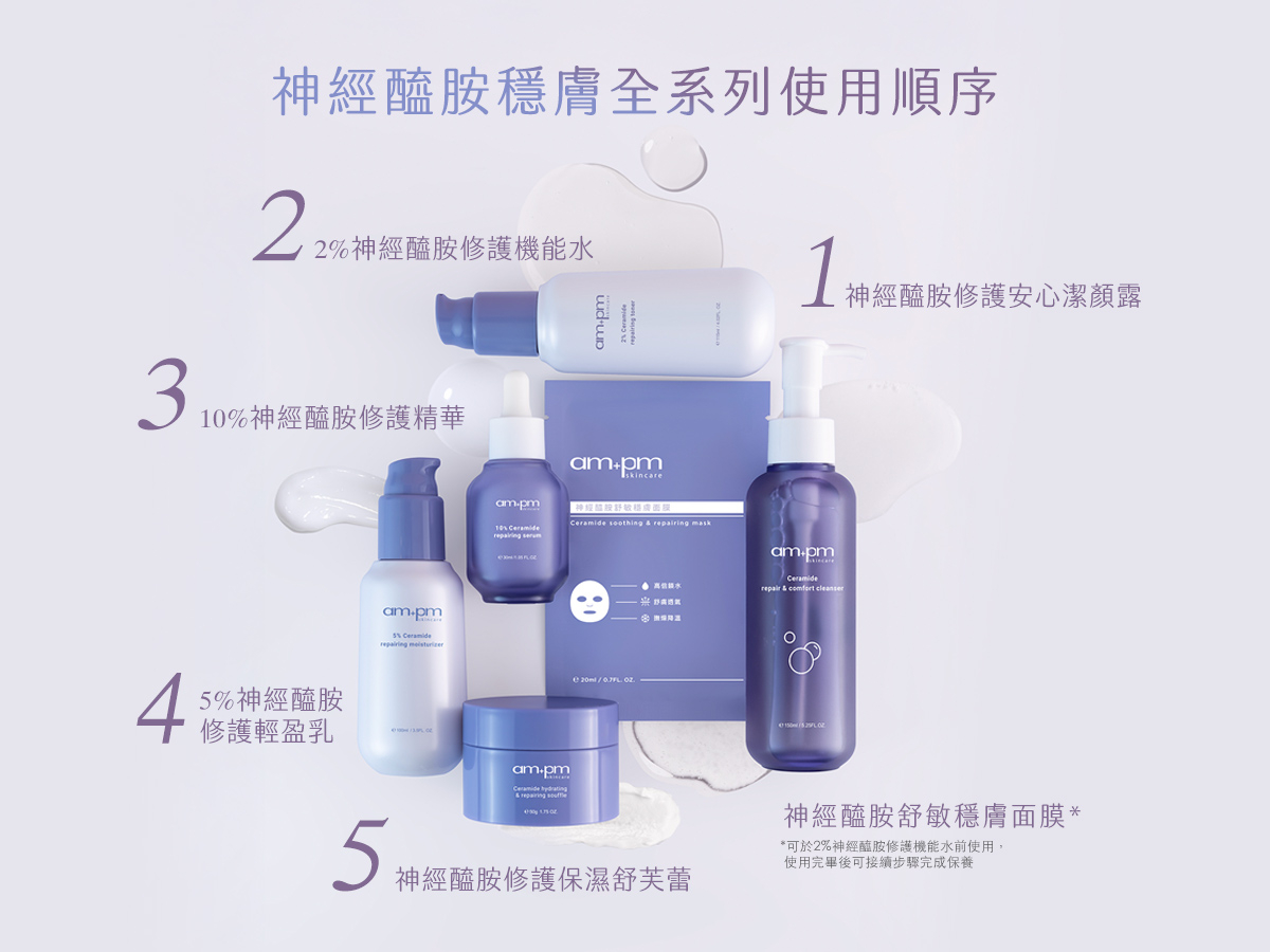除了潔顏露外,ampm 神經醯胺系列包含修護機能水、精華液、輕盈乳、舒芙蕾與舒敏面膜,從清潔到後續保養,形成完整的修護家族,幫助肌膚在多變氣候下維持健康安定。