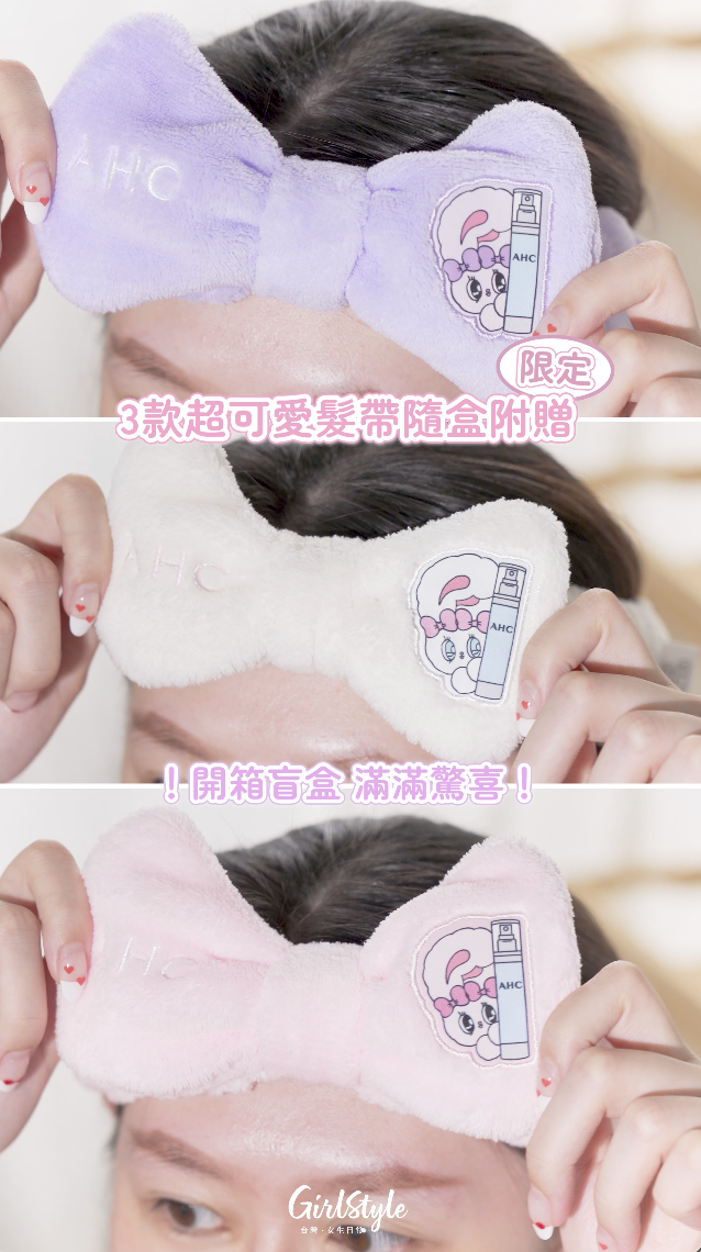 組合內不只包含有兩瓶 AHC全球熱銷的「超能玻尿酸機能水」,隨盒還會隨機附上一款「Esther Bunny 艾絲樂小兔」聯名髮帶,甜美粉、夢幻紫、雲朵白總共三色任妳抽,想像一下戴著Esther Bunny的髮帶邊敷臉邊追劇,實在太可愛又太療癒了~小編跟同事們已經約好要一起把三款髮帶通通收齊!