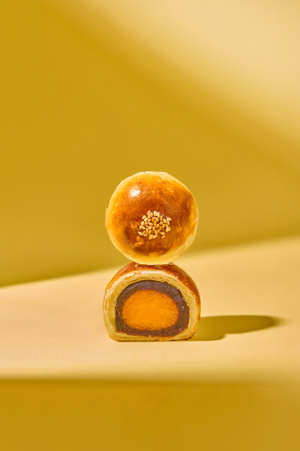 今年主打的「黃金酥」,外層薄脆、內餡綿密,嚴選花蓮瑞穗南瓜與屏東萬丹紅豆,搭配天然黑鹽,手工層層酥香,相較傳統蛋黃酥還能降低碳排70%。另有「芋泥香鬆酥」,選用大甲檳榔心芋與素香鬆,鹹甜交織、千層口感令人回味。經典小綠豆凸則綿密鬆軟、入口即化。