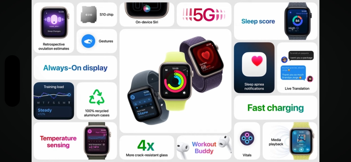 Apple Watch Series 11主打史上最薄、最舒適、耐用性加強,相較以往的Apple Watch耐刮度提升2倍。功能上支持高血壓提醒,獲准後將在全球150個地區推出,同時睡眠監測終於將有評分了,Apple Watch Series 11續航最長24小時。