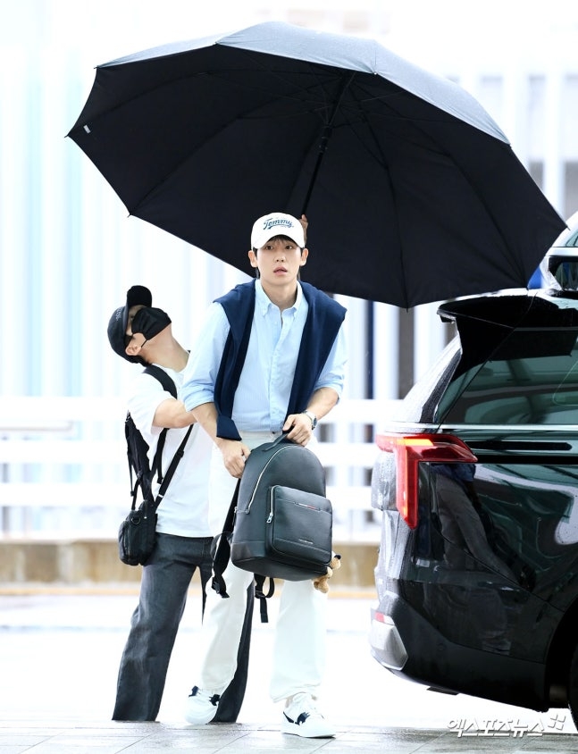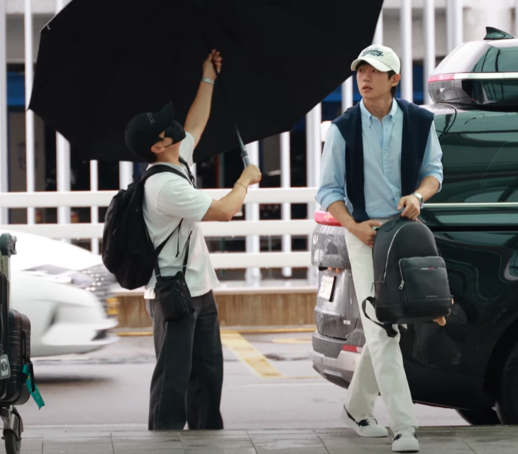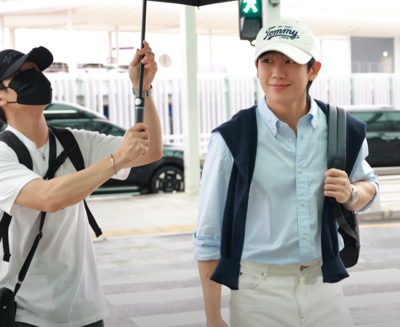丁海寅仁川機場「人品爭議」秒洗白!被質疑欺負經紀人撐「巨型雨傘」,真相曝光網笑翻:「合法苦力沒關係」