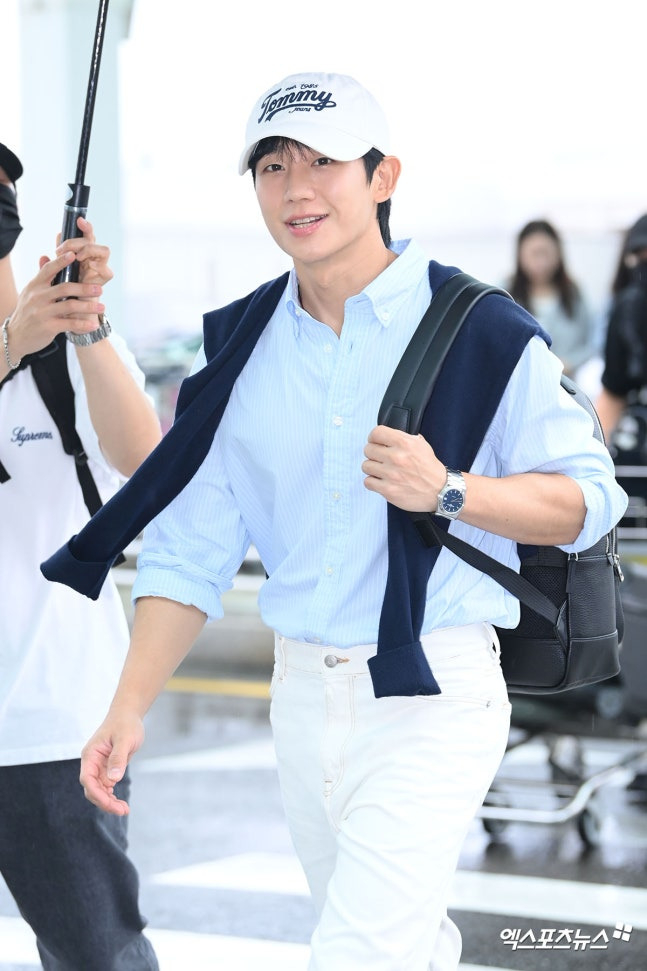 最近丁海寅出席Tommy Hilfiger的品牌拍攝須前往海外,到仁川機場時他從容不迫的下車,面對等待的粉絲及記者丁海寅也面帶笑容親切打招呼。不過因為當天是下雨天,因此工作人員在一旁幫忙撐傘,沒想到撐開傘的那瞬間,大家直接傻眼爆笑。