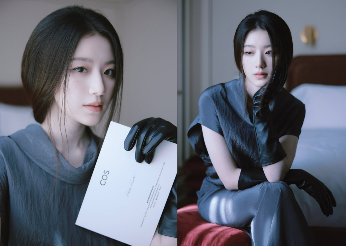 idle 舒華首次受邀出席紐約時裝週,驚喜現身 COS 2025秋冬大秀前排嘉賓,身穿一襲 COS 灰色連身衣搭配黑色皮革手套,有別於在舞台上的繁複裝飾,以俐落線條、低飽和色彩為主,深邃的灰色調更襯托舒華的白皙肌膚,詮釋出一股率性又復古優雅的獨特氣質。