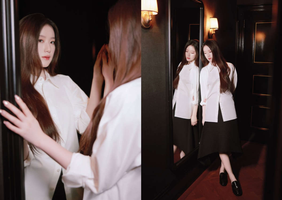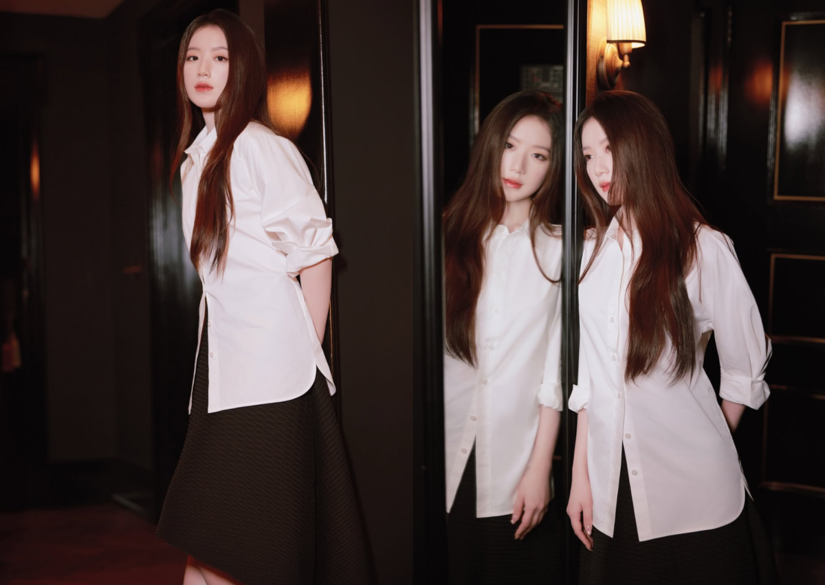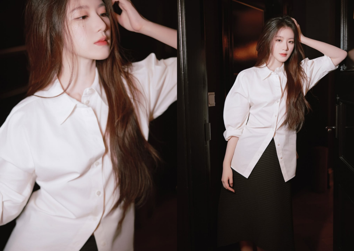 接著舒華在秀後換上同樣來自 COS 2025 秋冬系列新裝,一件平常的白襯衫搭配黑色中長裙,在舒華身上顯得特別美!選擇帶有收腰剪裁線條的廓形襯衫,袖子設計成九分袖,仔細一看可以發現看似平凡的白襯衫,其實藏有許多細節,襯衫下擺的傘狀弧形恰如其分地呼應下身黑色裙,整體造型端莊又優雅,好適合刷!