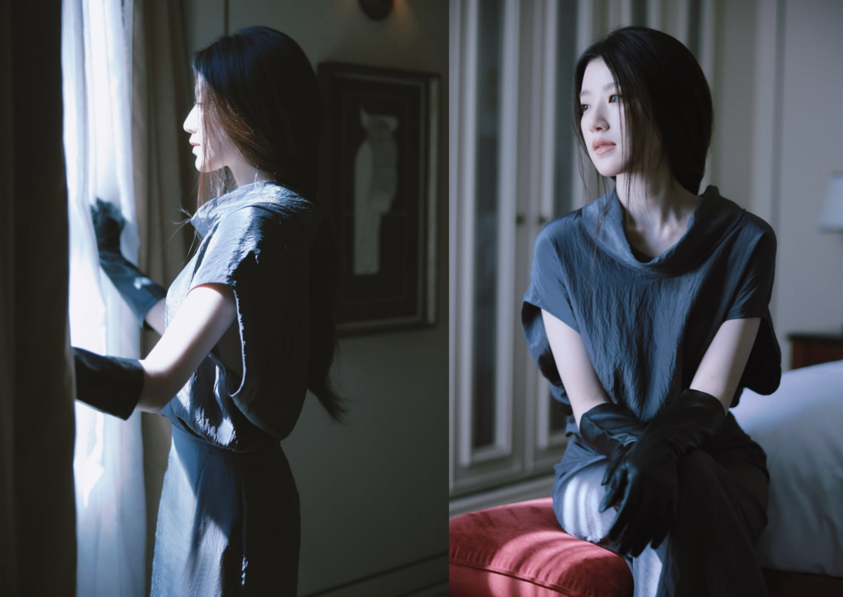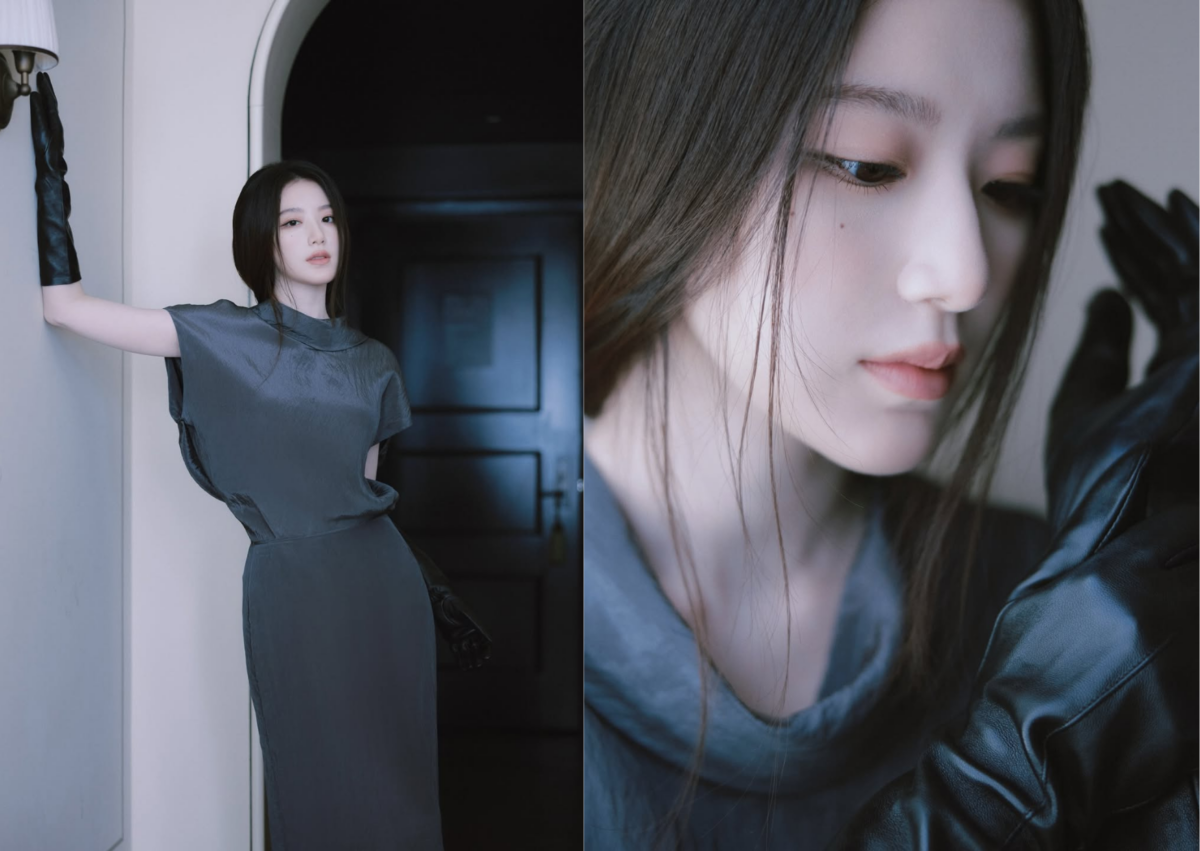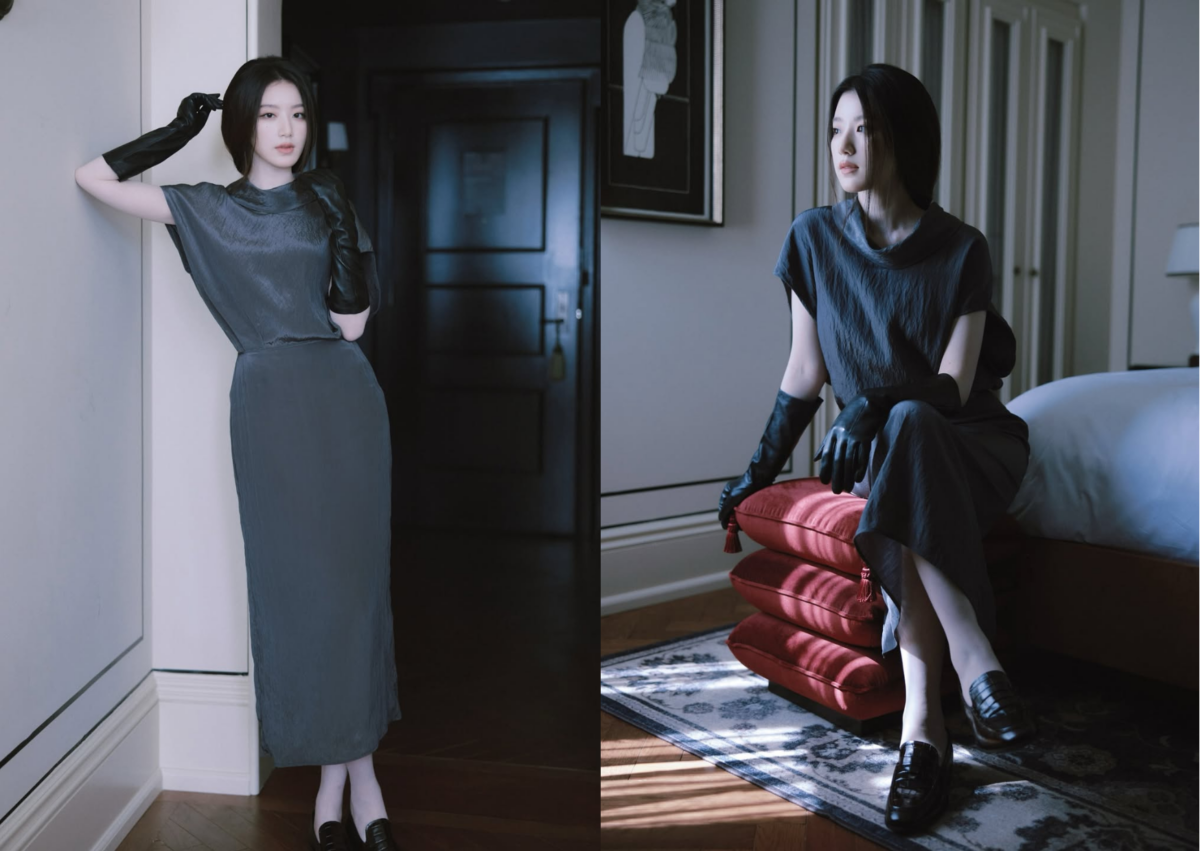 這也是舒華首次嘗試較為典雅、優雅知性的妝造,選擇帶有古典氣息的俐落連身裙,面料呈現不規則微微抽皺感,領口和袖子刻意營造隨性線條,黑色皮革手套的異材質結合更是襯托出現代復古感,髮型則是參考秀上模特兒所精心設計的造型,照片一釋出立刻讓網友直呼:「為何刷總是美得讓人頭疼?」
