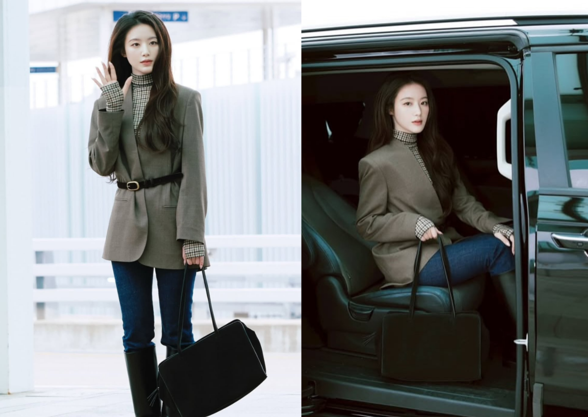 出發看秀前的機場穿搭,舒華早已掀起一波熱潮,身著 COS 2025 秋冬系列新裝低飽和咖啡色無領西裝外套、格紋高領和合身牛仔褲,手拿一顆黑色麂皮 Tote Bag,腰間的皮帶和黑色長靴注入正裝感,搭配高領清新的精緻臉蛋和長捲髮,整套造型走穩穩的「御姐風穿搭」,比起過往的造型,這幾套時裝週穿搭相對更適合舒華的氣質和風格。