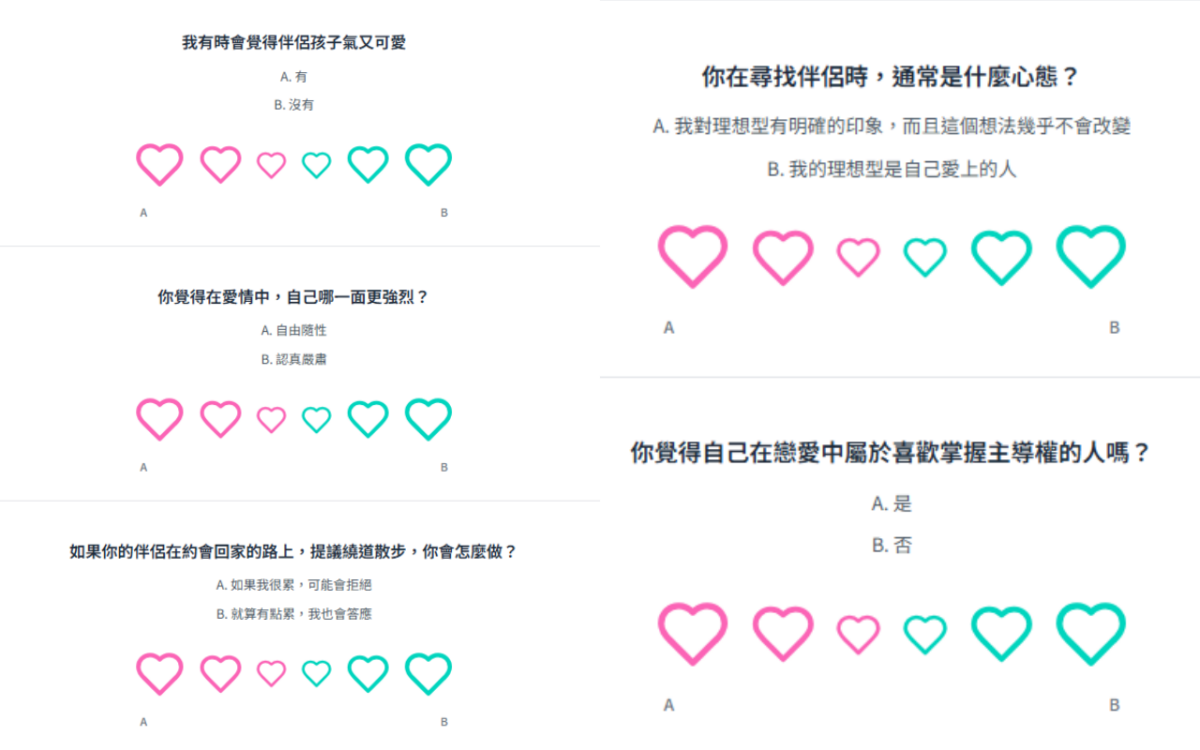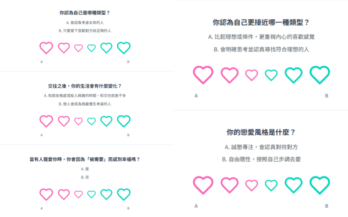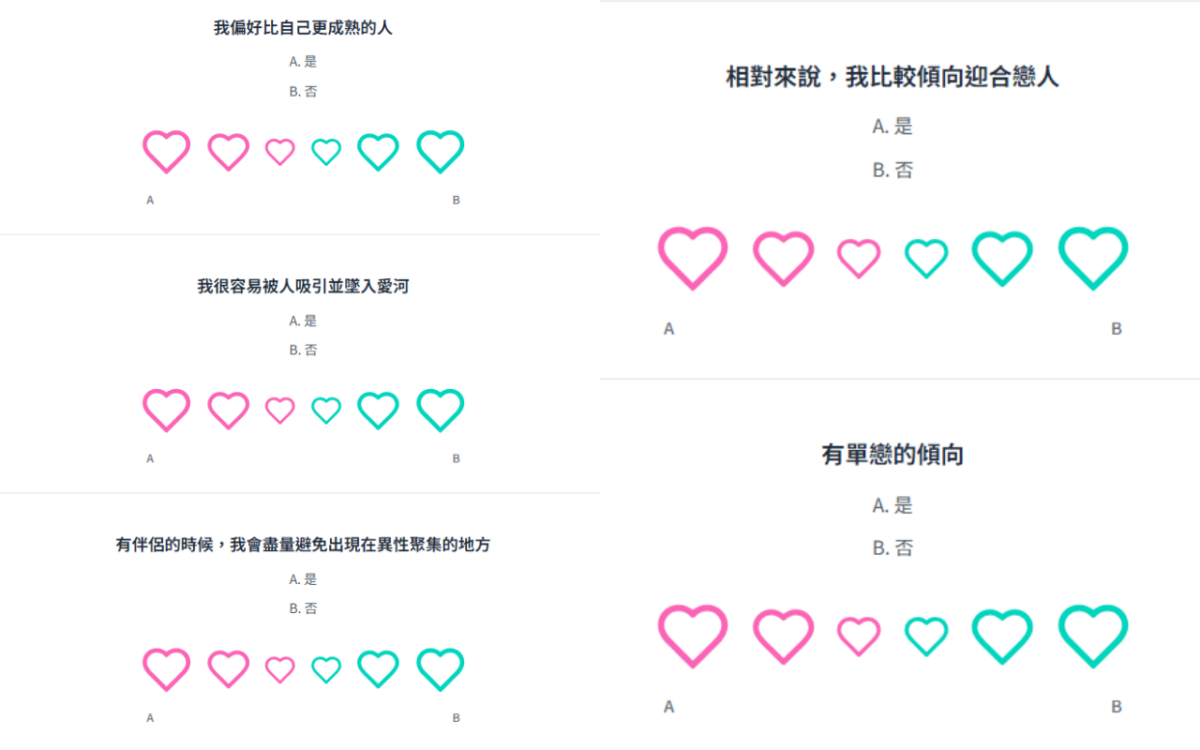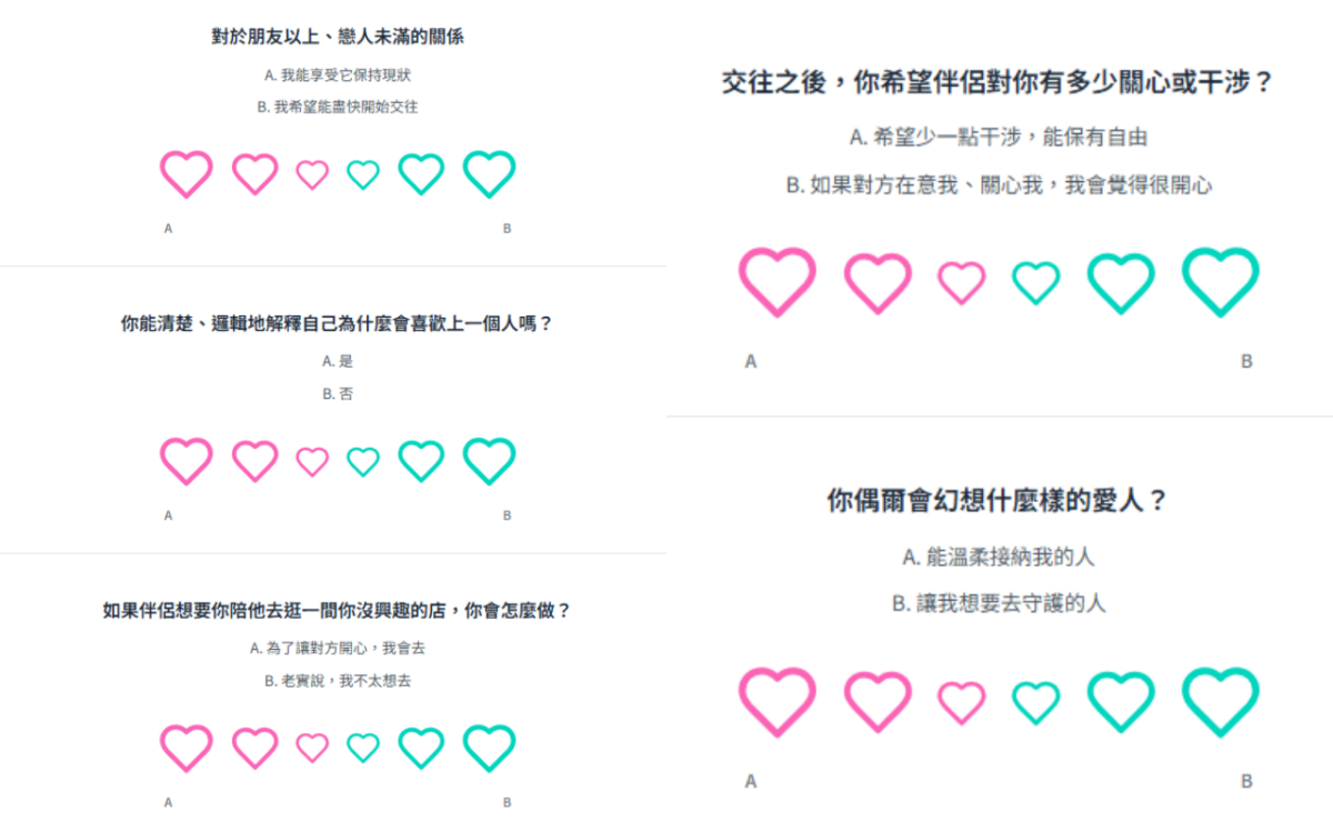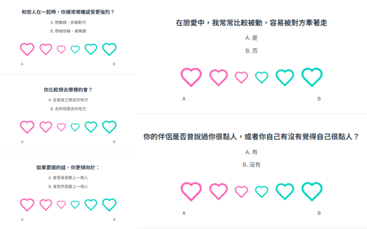 進入測驗頁面後,只要依直覺或依據經驗回答一連串與約會、承諾、衝突處理相關的單選題,給出不同層次量表的程度。16個簡單的問題短短5分鐘內就可以迅速完成不用擔心需要思考太久~