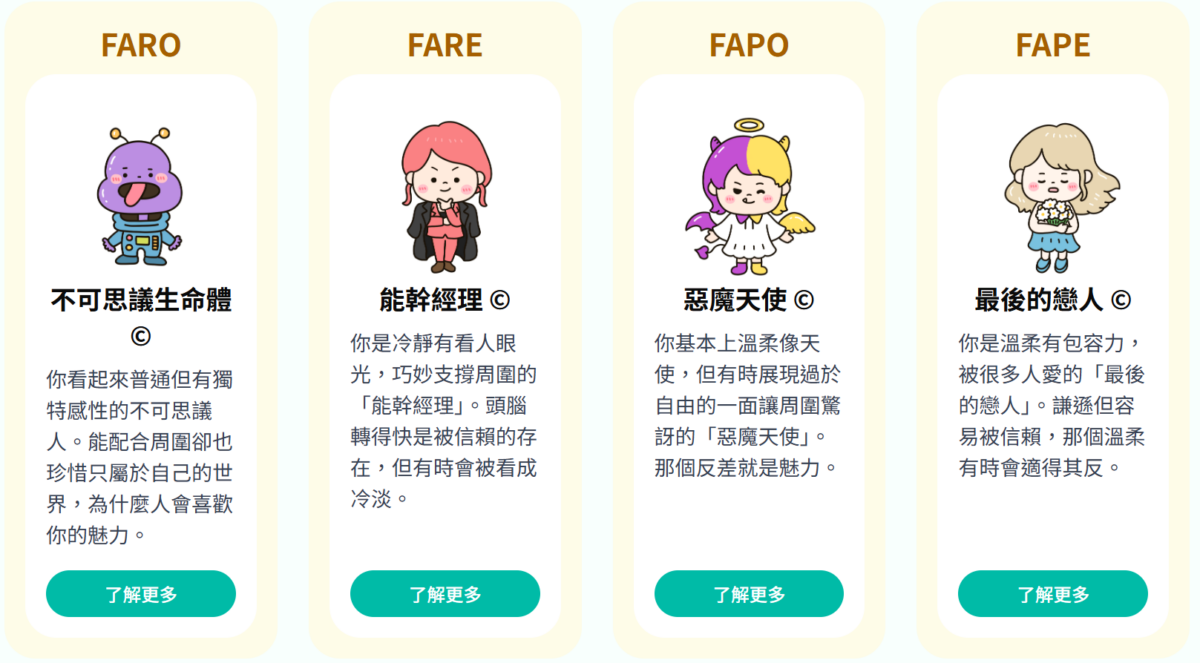 回答完成後馬上就能得到結果的角色敘述、優勢盲點與相性建議的四碼與稱號。