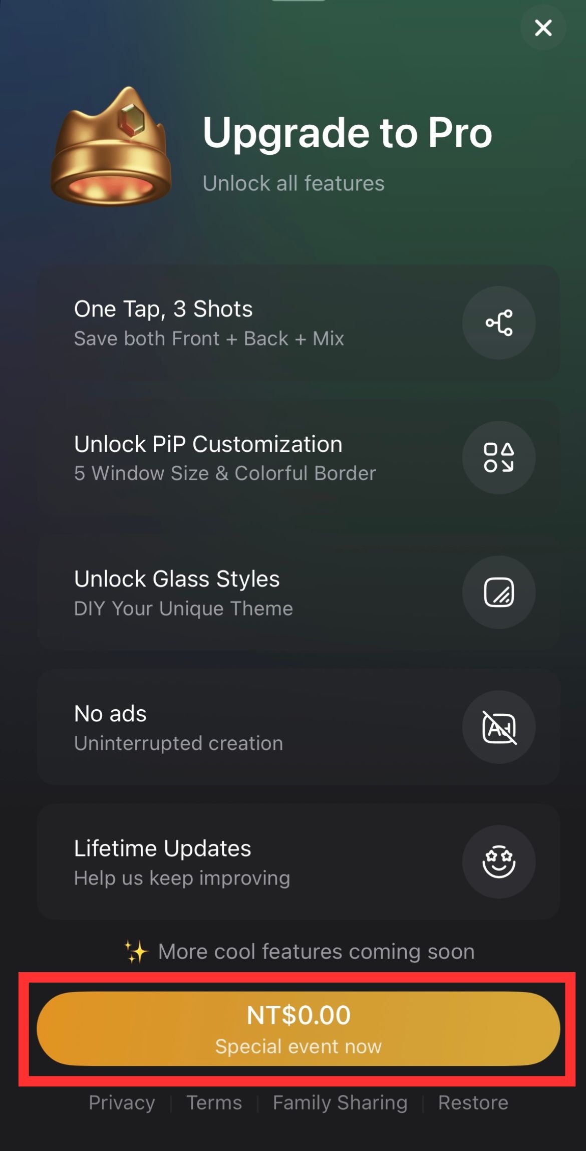 2.首次打開會出現購買Pro的頁面(如果跳掉可以進入設定找到),購買的按鈕會顯示0元,按下後就能立即獲得終生免費會員了