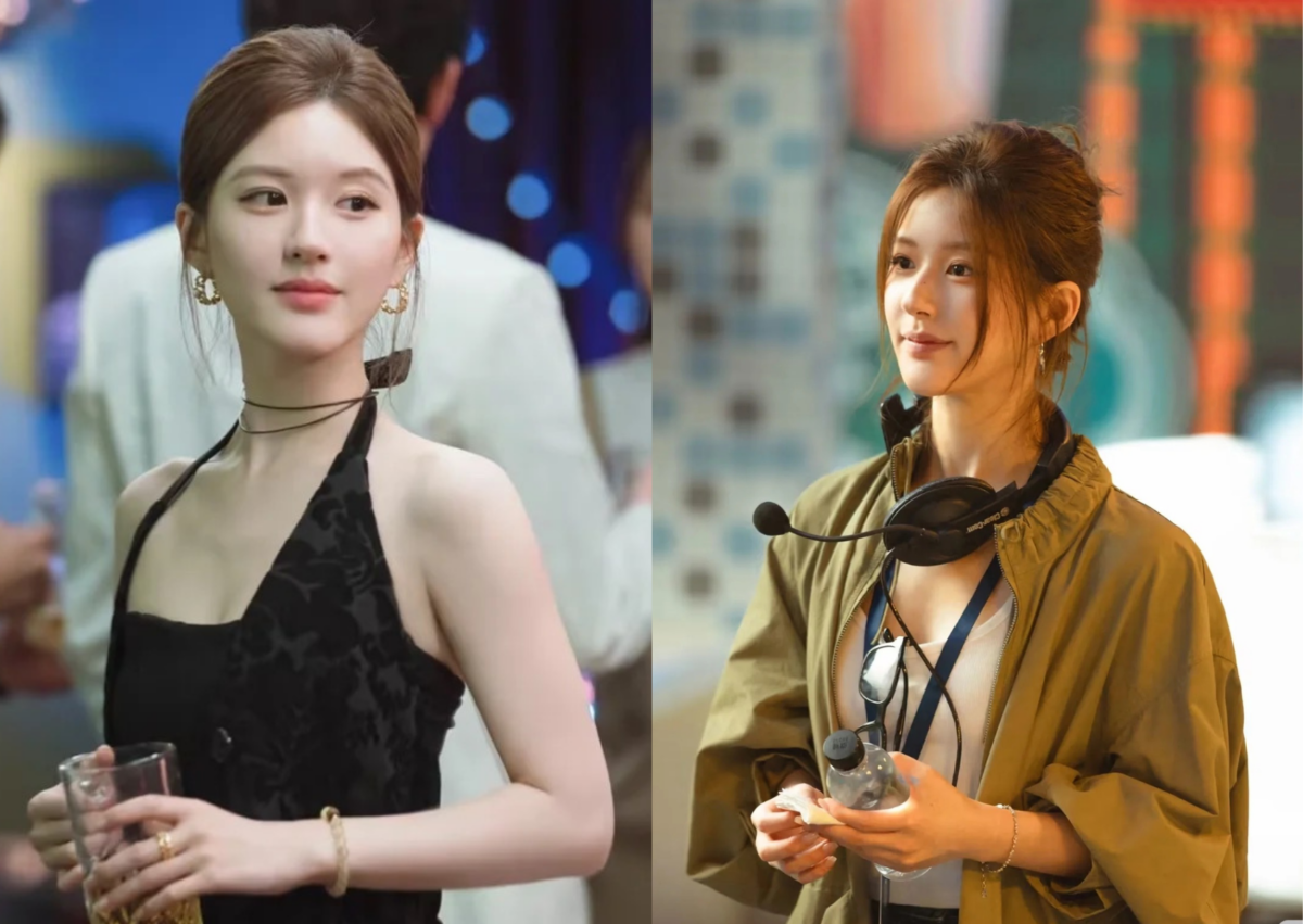 許妍(趙露思飾)在節目準備與外勤轉場時,最常見的就是「上亮下鬆」這一套穿搭公式,像是真絲襯衫打大蝴蝶結,搭配淺藍直筒或微喇牛仔褲,既有鏡頭需要的精神亮度,又保留通勤的舒適度,腳下多是尖頭跟鞋或俐落樂福鞋,把比例拉長、氣場穩住。
