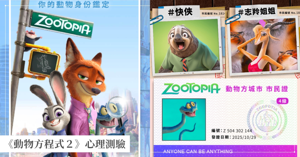 《動物方程式2》「你的動物身分鑑定」心理測驗!跟著茱蒂、尼克辦案領取專屬市民證,分析自己社牛&魅力指數