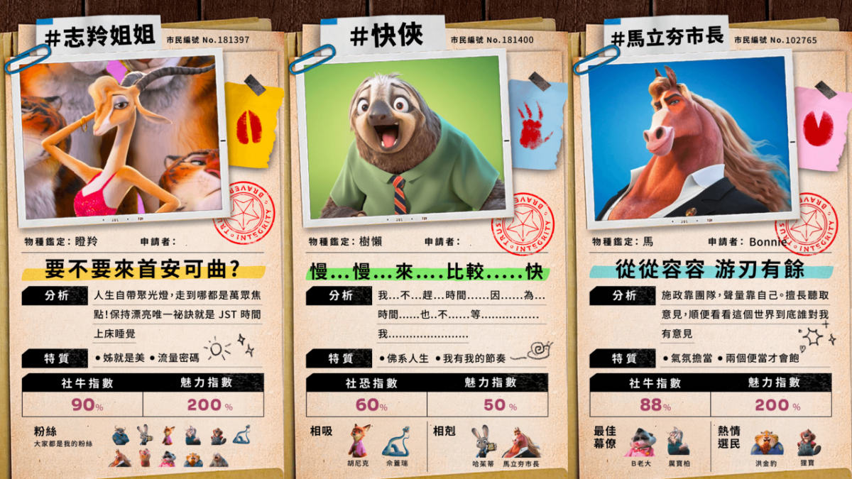 除經典主角「哈茱蒂」「胡尼克」外,還包含志羚姐姐、快俠、洪金豹、馬力夯市長、茸茸博士、楊咩咩、狸貓警員(狸寶)、冰棍老大B老大等;不同角色會搭配一段精簡卻到位的性格標籤,並加上「社牛指數」「魅力指數」等量化評分,方便你一眼看出自己的社交能量與吸引力屬性!