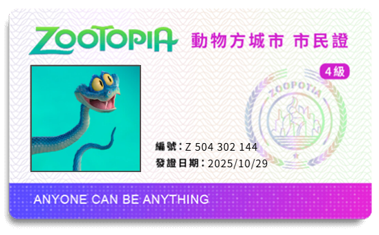 完成任務後,你會獲得一張專屬「市民證」,上面包含個人編號、發證日期與角色分級,視覺設計延續電影世界觀;同時頁面會彈出與茱蒂、尼克的合照畫面,非常適合直接截圖分享!