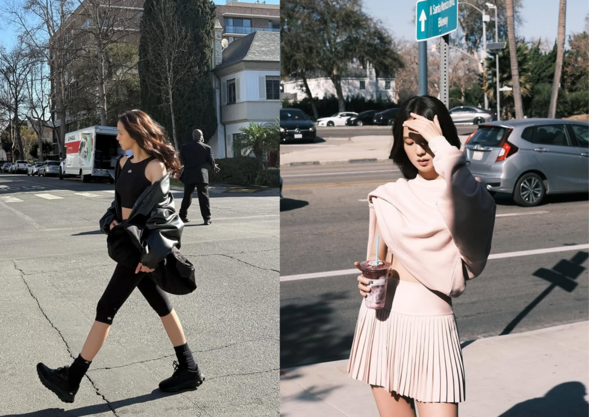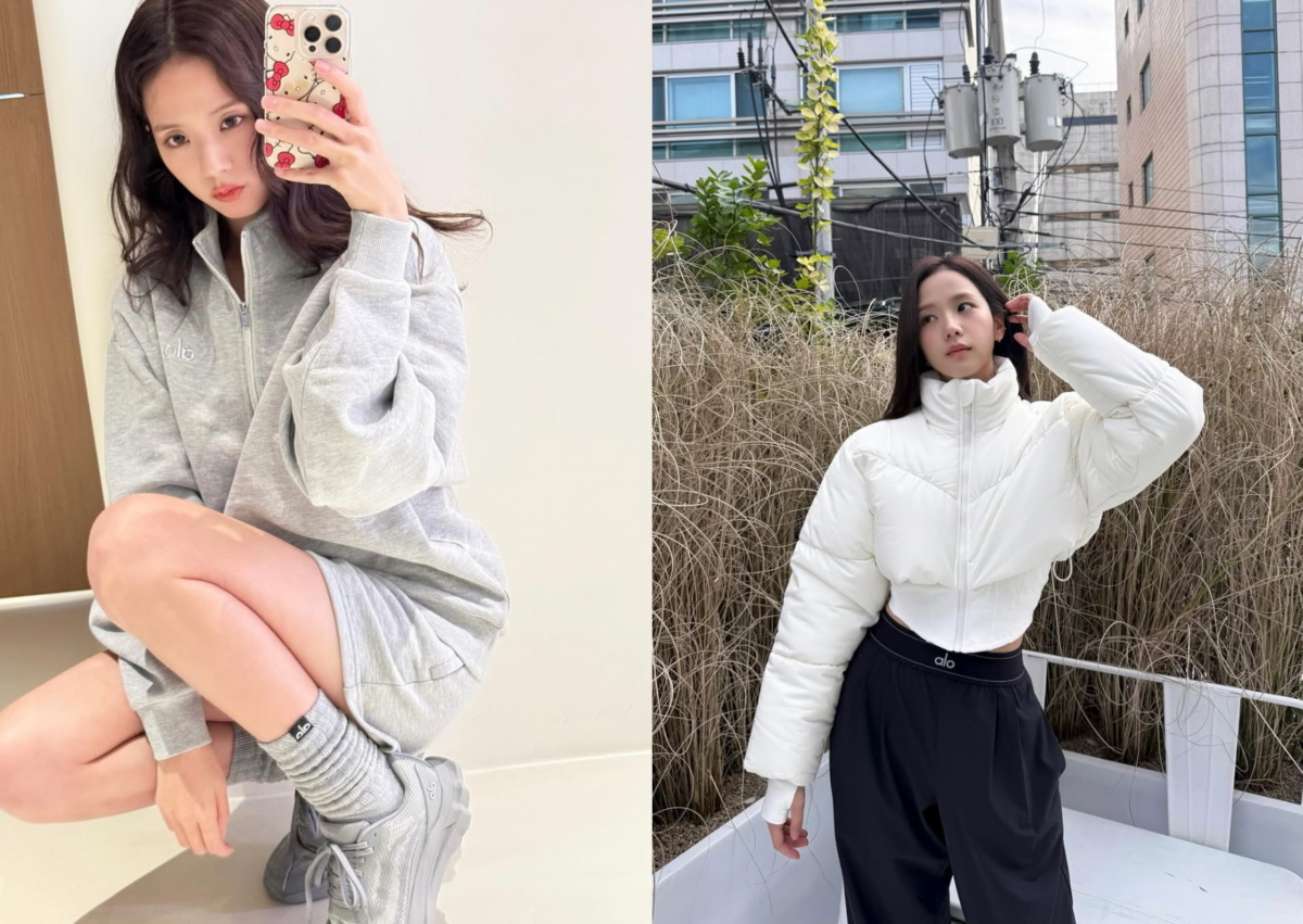 Jisoo 穿著 Alo 最常見組合是 Airlift Bra Top 搭配 Legging,運動內搭加上外套混搭最不容易失誤,以短版 Bra Top 與高腰 Legging 為核心,搭配 Oversized 皮衣或男友襯衫,鏡頭前立刻從健身狀態切到街拍感;同色系成套最常見是霧米、奶油或淡粉成套上陣,上下同色拉長比例,微霧面材質在自然光下更顯高級;或是以瑜伽褲配針織開衫、皮革外套等,維持乾淨線條不過度配飾,焦點放在版型上。