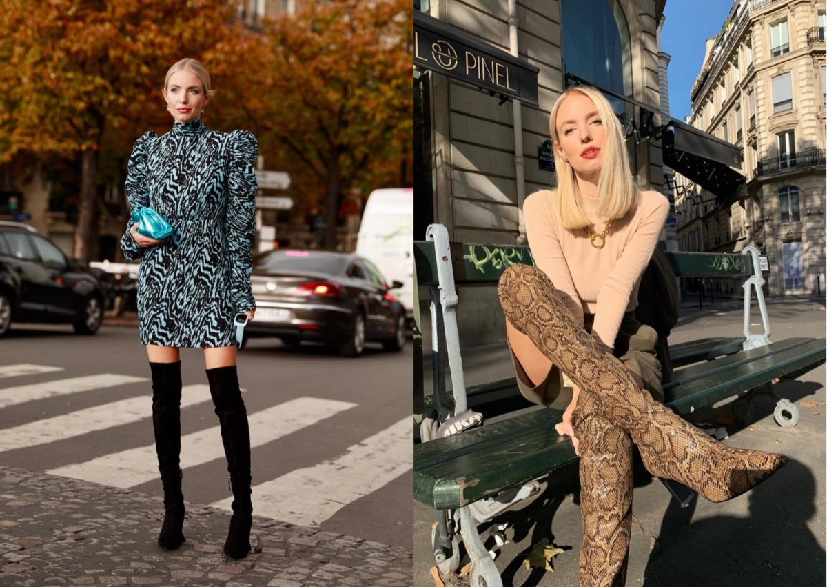 鱷魚壓紋、蟒蛇紋或蜥蜴紋等動物紋理壓花皮革,是長靴中提升質感和奢華度的細節元素,這種靴款多採用直筒及膝設計,強調材質本身的視覺光澤和紋理深度,屬於較為成熟且高貴的風格,適合打造都會女性的精緻形象。