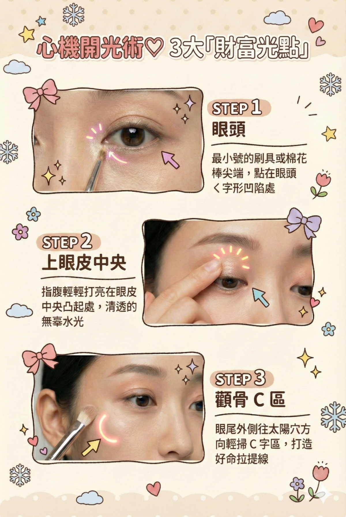 上眼皮中央:畫完眼影後,用指腹輕輕打亮在眼皮中央凸起處。眨眼或低頭時,就能捕捉到一抹細微的光芒,在眨眼間讓眼神充滿清透的無辜水光。