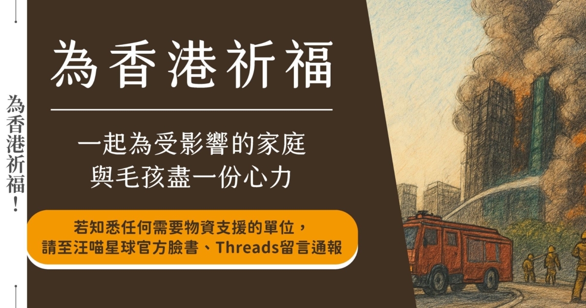 【11 月 29 日,台北訊】香港新界大埔宏福苑 11 月 26 日發生近年最嚴重的五級火警,火勢延燒多棟大樓,造成至少 128 人罹難、逾 200 人失聯,並有至少 150 隻以上的寵物受困,許多飼主徹夜守在封鎖線外焦急等待,盼望毛孩能平安獲救。這場災難不僅撕裂了居民的日常,也讓無數家庭在混亂與不安中度過最煎熬的時刻。