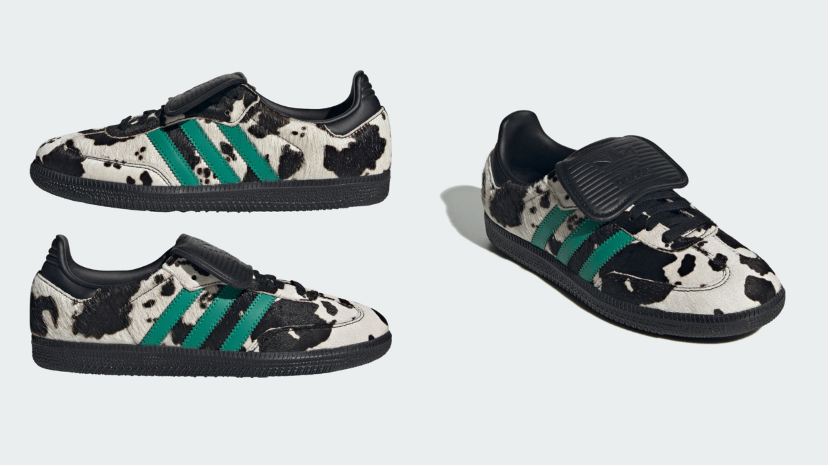 另一雙則是 adidas Originals SAMBA LT W 乳牛款式,同樣採用經典鞋底及設計製成,這雙重點是在外翻鞋舌加上短毛的乳牛紋,吸睛卻不過分誇張,再注入搶眼的綠色三線點綴,多了繽紛俏皮的小細節,既中性又有個性。