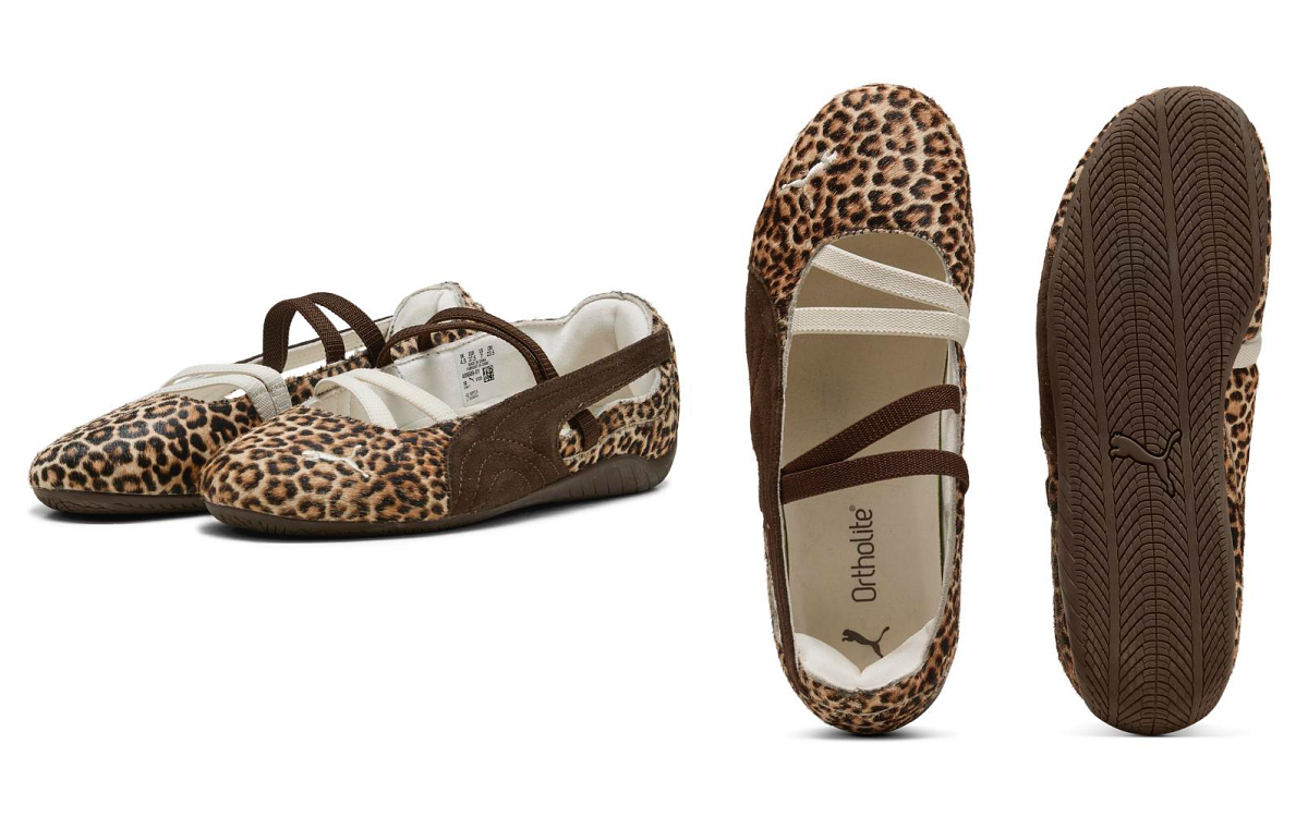第一雙先來介紹到現在都還在缺貨的 Puma 爆款芭蕾舞鞋,Speedcat Ballet Wild 結合賽車鞋薄底與芭蕾舞鞋的優雅線條,打造出話題十足的豹紋瑪莉珍鞋,鞋面以細緻豹紋布料搭配深棕色拼接,雙交叉鬆緊帶設計,增添舞鞋精緻度,輕鬆平衡了野性與甜美。
