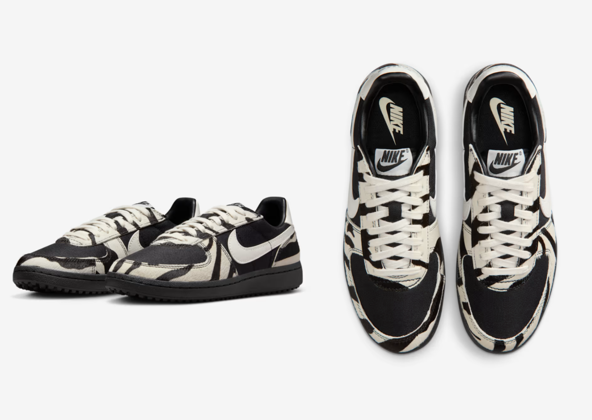 Nike Field General 除了先前提到的豹紋款式,甚至還率先推出了少見的斑馬紋!結合帆布與斑馬紋毛料拼接設計,為復古美式橄欖球風格注入新意,顆粒感十足的鬆餅鞋底,為整體造型帶來濃厚的復古美式運動氛圍。