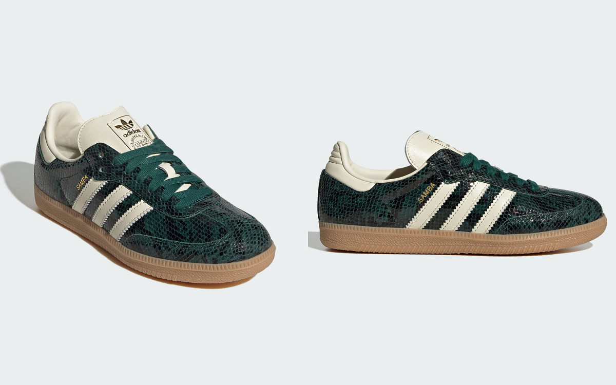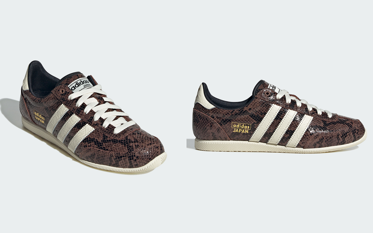 除了野性豹紋外,adidas Originals 本季同樣延伸出低調又奢華的蛇紋設計,將異材質質感與經典輪廓完美融合,鞋面注入棕色蛇皮紋理細節,搭配純白三線撞色,呈現義式復古的華麗風貌,這種設計高級卻不顯老氣,讓年輕人也能輕鬆駕馭蛇皮紋,成為街頭最受矚目的焦點。