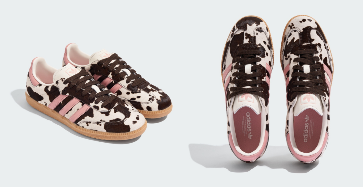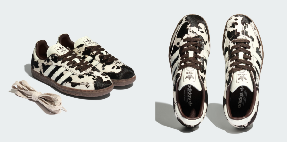 adidas Originals 經典 SAMBA OG 也換上超吸睛的乳牛紋馬毛設計,鞋型源於 20 世紀的足球盛宴,現在已成為品牌主打鞋型,不論是黑白斑點的野性元素碰撞巧克力棕色,或是搭配夢幻的粉紅三線,都能成為潮流女孩的新寵,經典膠底與低筒設計依舊非常舒適耐穿。
