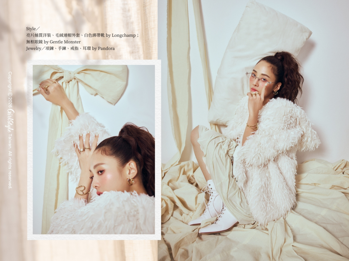 「甜酷」不一定要是夢幻粉紅色,更可說是自信的象徵,服裝上採用挺版、廓形延伸,營造既親近又帶界線的氣場,甜美感被收斂進線條裡,說明她走到人生新階段後,對自我選擇的篤定宣示。「其實我以前也有很多眉角,後來我敞開心胸去嘗試之後,才發現很多原本我以為不行的造型,其實放在我身上也可以是好看的,所以我覺得大膽嘗試是一個很重要的心態。」