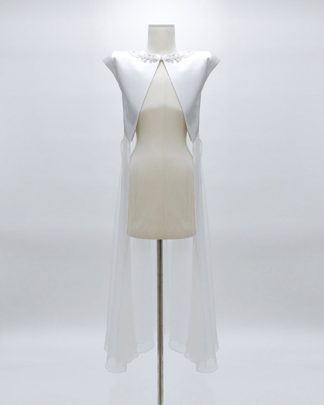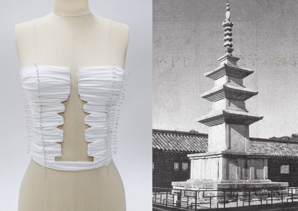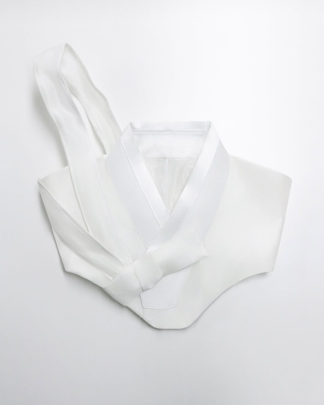 開場結束後,Jennie 褪下數公尺韓文字的白紗後,內層穿著一件擁有構造感肩線的長袍,靈感源自於韓國國寶「半跏思惟像」的服飾線條,點綴了工匠手工製作的韓國繩結。