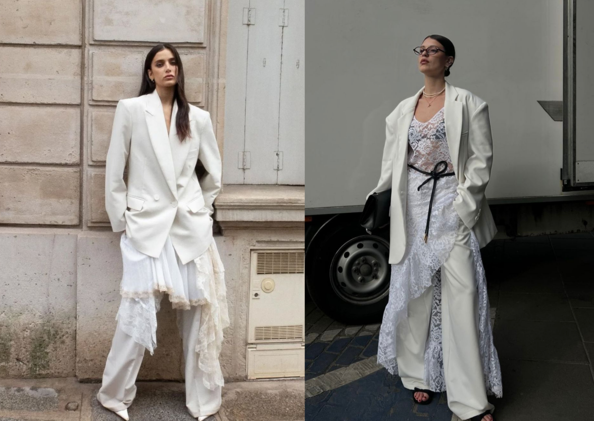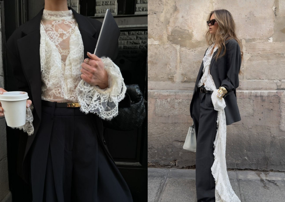 西裝搭蕾絲比起前面提到的皮革搭蕾絲,多了一份知性、專業俐落感,看起來沒那麼衝突,卻仍帶有耐人尋味的氣息,這是一個極具當代詩人的穿搭場景,在清冷、理性的城市氛圍中,穿著一件剪裁俐落、甚至帶點寬大男裝輪廓的極簡西裝外套,而領口卻驚喜地綻放出一抹繁複的蕾絲。