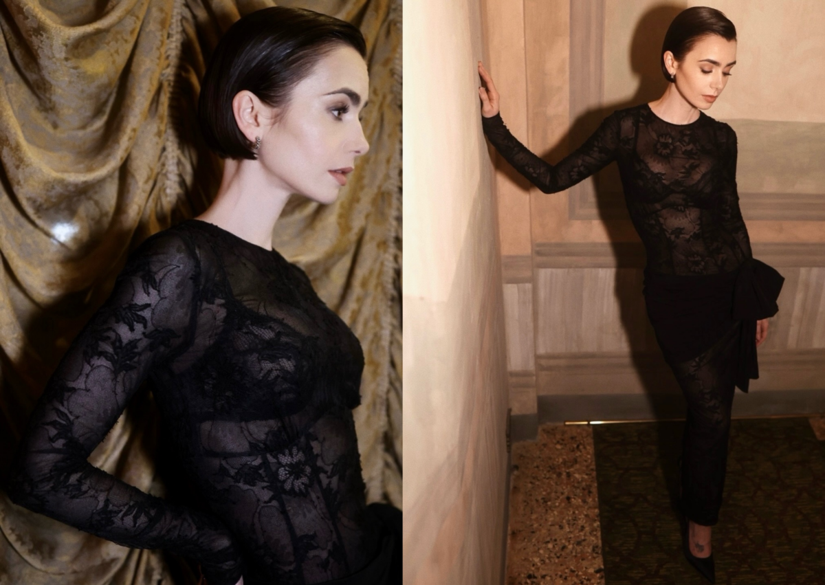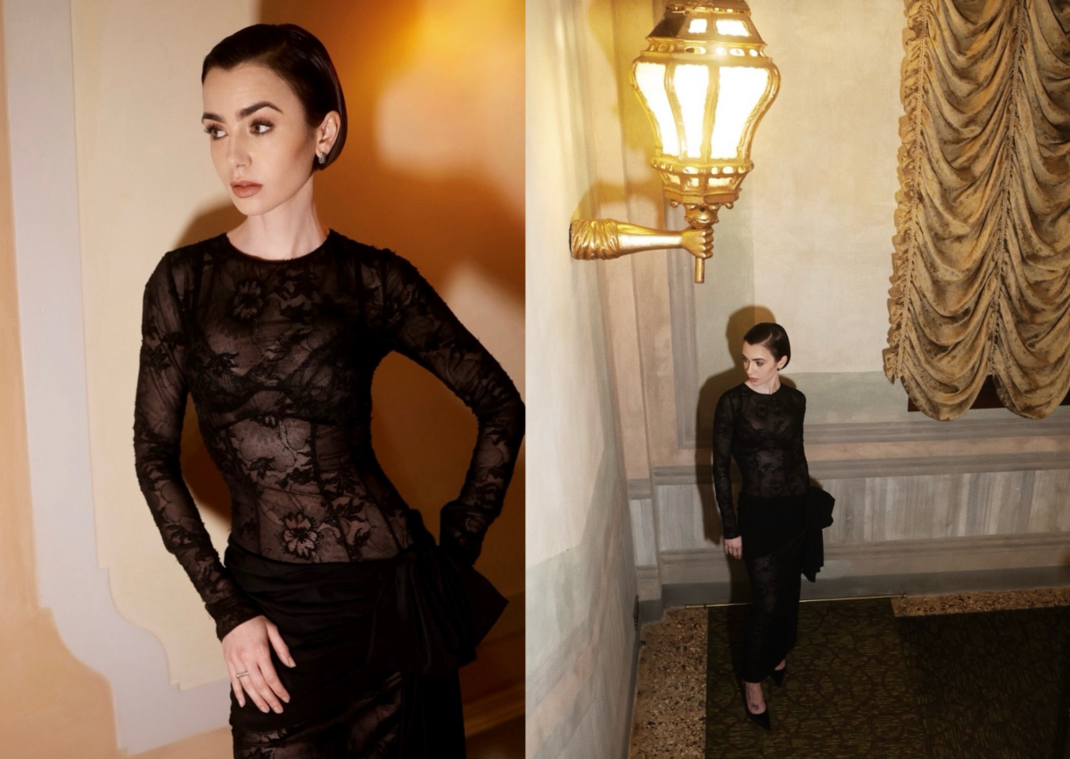Lily Collins 禮服 05:Alessandra Rich 黑色蕾絲透膚連身