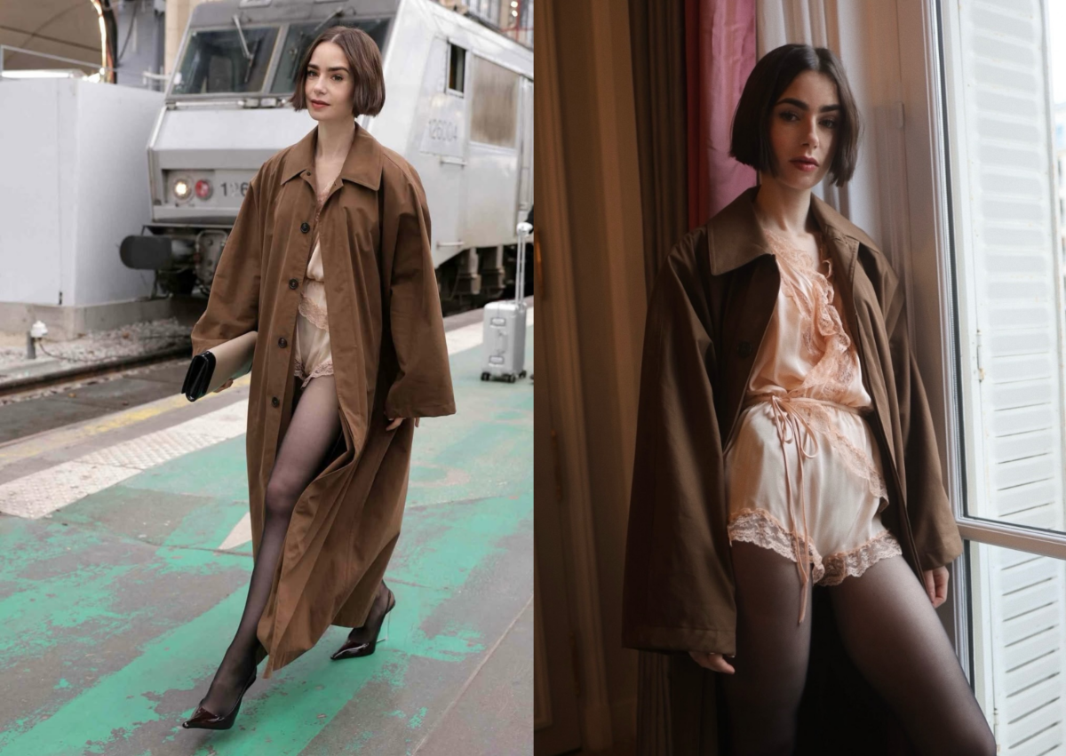Lily Collins 身上這條 SAINT LAURENT 蕾絲連身褲裙,和之前 BLACKPINK Rose 出席時裝週身上那件是同款設計, 從淺藍色換到粉橘色,同樣性感又浪漫,面料採用高級綢緞製成,打造如睡衣般的親密感,下身搭配黑絲襪,讓整體稍微正式感一些,Lily Collins 選擇外加一件咖色風衣長外套,更是平衡了整套 Look。