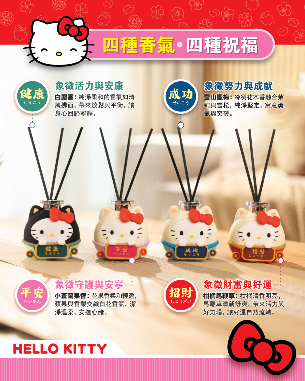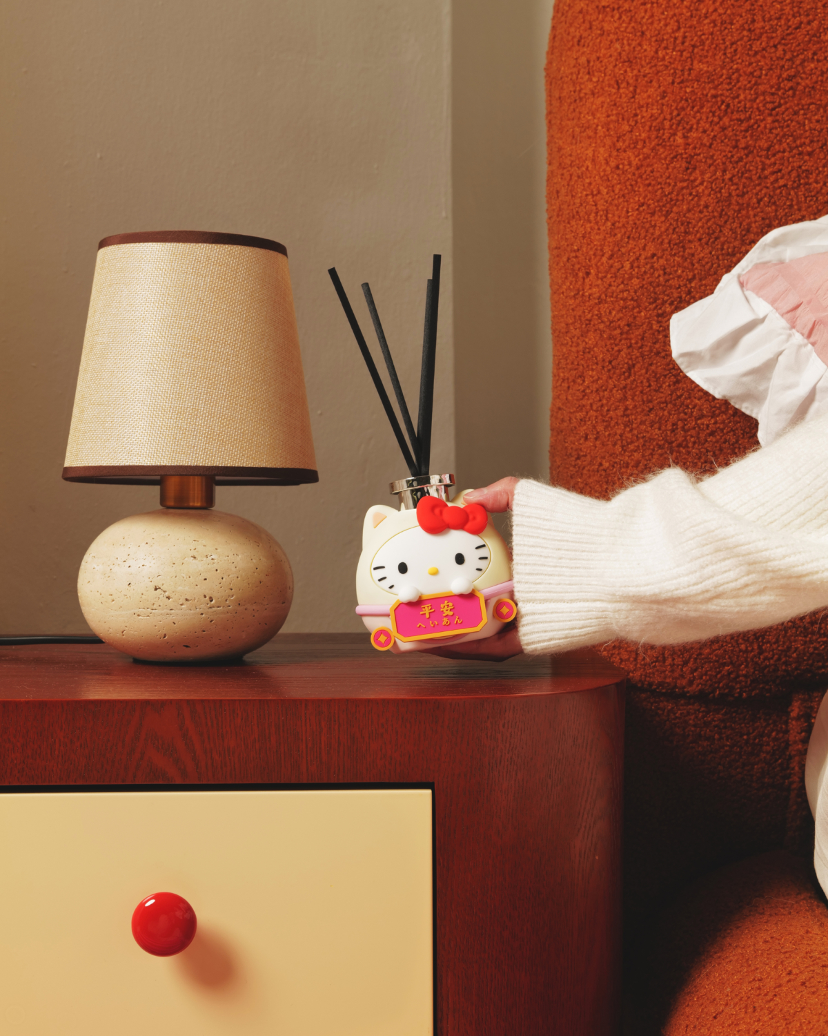 這次的聯名系列特別結合了日本祈願文化的意象,瓶身延續 Sanrio 經典夢幻筆觸,線條柔和且精緻,再搭配 Hello Kitty 標誌性的紅色蝴蝶結,簡直是可愛與質感的完美結合!無論擺在客廳、臥室或玄關,都能自然融入空間,成為家中最溫暖的一角。