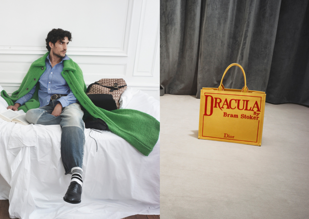搶眼的男裝亮黃色斜背包則向另一部經典文學、出自小說家 Bram Stoker 的《德古拉》(Dracula)致敬;LadyDior 則由美國藝術家 Sheila Hicks 重新演繹,以亞麻製成的馬尾織成繭狀包覆。