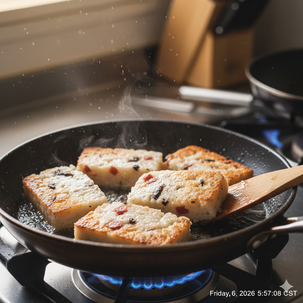 不要急著翻面:這是最重要的秘密!下鍋後用中火煎,觀察邊緣開始呈現微微焦黃色時再翻面。頻繁翻動是蘿蔔糕破碎的主因。