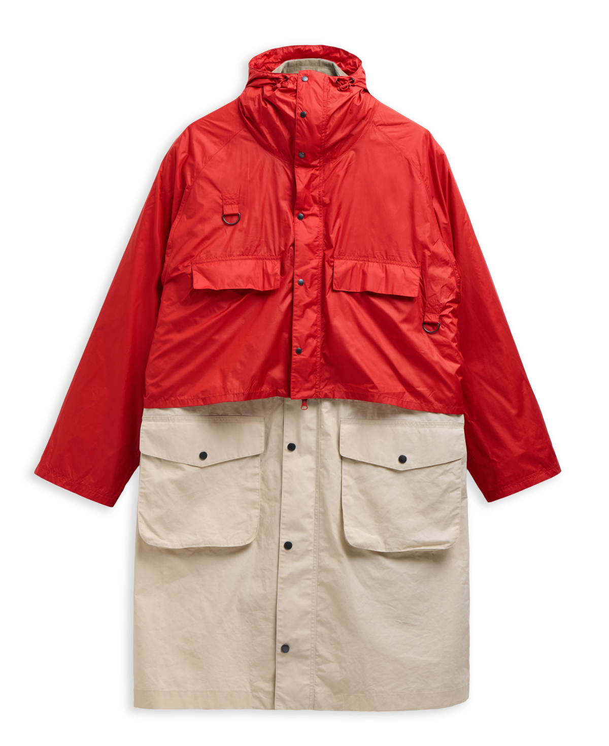 靈感源自Barbour經典Endurance Jacket,並融入軍裝派克大衣的輪廓線索,以可變化穿著的設計思維重新詮釋英倫經典外套。整體呈現俐落的長版線條,兼顧實穿性與造型比例,回應當代生活中對機能與層次的需求。主外套採用約200g輕盈且具挺度的棉質布料製作,細節配置包含Barbour標誌性的風琴口袋、暖手口袋與燈芯絨領,並加入可調節袖口與背面大型開衩設計,兼顧活動靈活度與穿著舒適性。外層搭配一件短版連帽外套,採用輕量材質製作,比例靈感取自Spey Jacket。主外套與外層可依需求自由拆開為單穿或疊搭,展現 3-in-1 可變化穿搭 的多元組合方式,靈活因應日常穿著與天候變化。