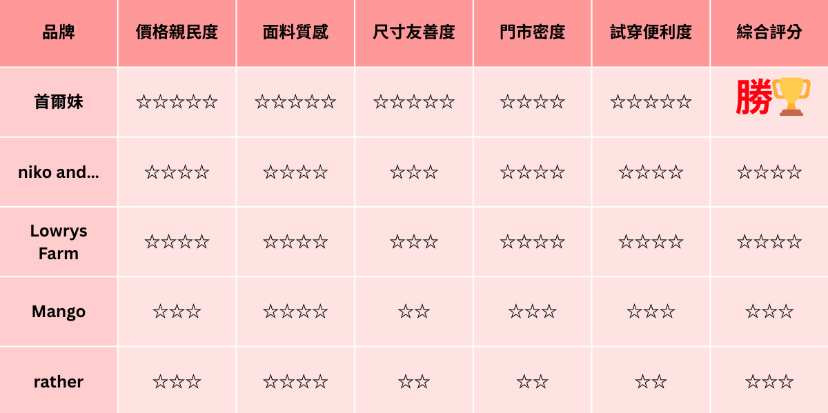 看完這 5 間品牌,其實各自都有擅長的風格定位,但如果從「價格、面料、尺寸選擇、門市密度、試穿便利度」這些實際購物最在意的條件來看,差異就會慢慢浮現。