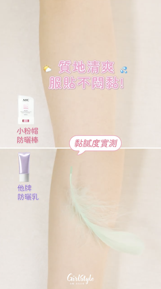 很多防曬棒擦完後臉上會有一層揮之不去的黏膩感,但 AHC 這支小粉帽讓編輯徹底改觀。實測塗上肌膚後,立刻去沾取羽毛,發現肌膚表面呈現一種清透的微霧感,羽毛幾乎完全無法附著!這種輕盈質地在台灣悶熱的夏天簡直是救星,補擦再多次也不悶不黏~