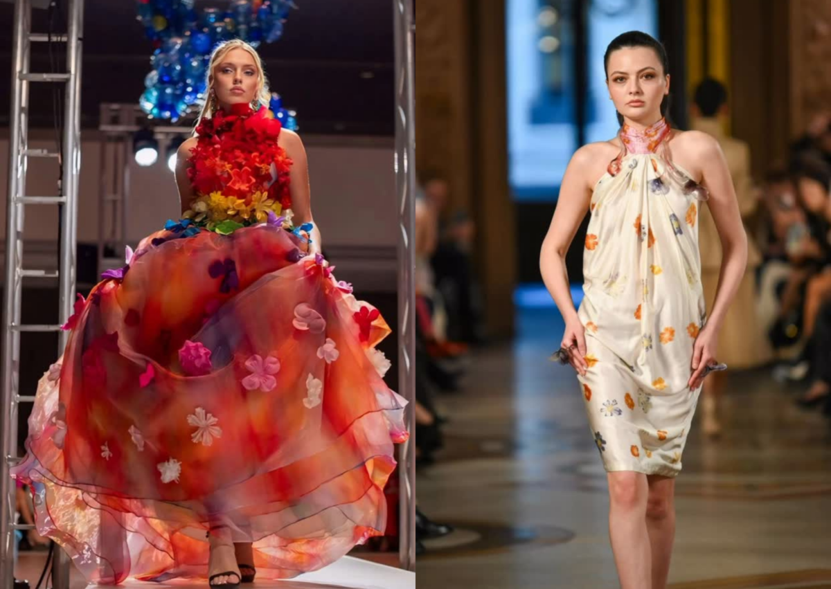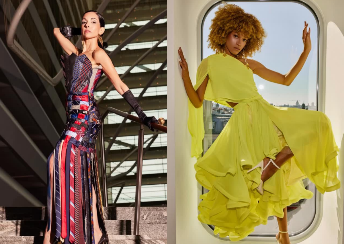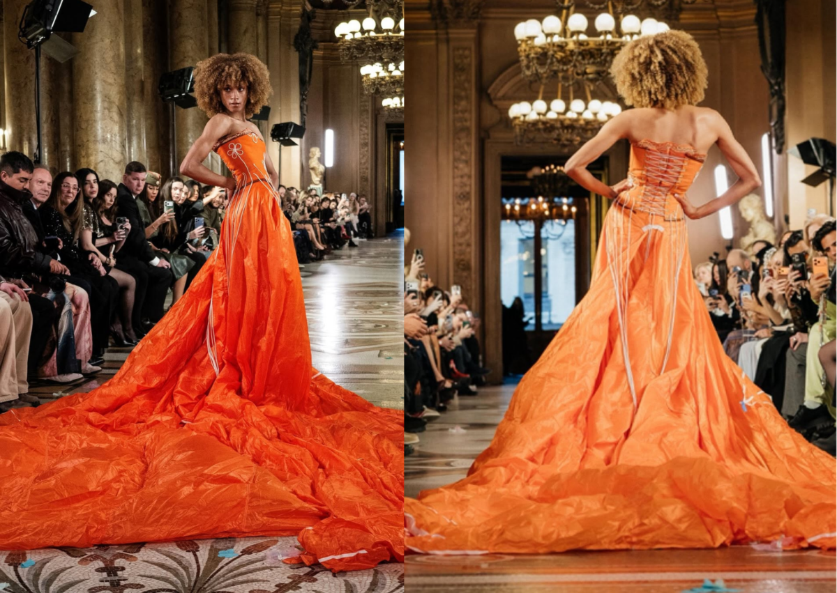 在 2026 年的這場巴黎大秀中,Max 把那些被大家隨手亂丟的 Hermès 防塵袋拆解、重組,變成了一套充滿結構感的馬甲禮服,另外他還用了 50 年前的印度古董紗麗與法國軍用降落傘混搭,伸展台上我們看到了結構完美的凸顯腰線圓裙、如空氣般輕盈的薄紗拖尾,甚至還有會隨著步伐灑落彩色碎片的禮服,現場展示的 15 套作品,90% 都是來自品牌剩餘的庫存,以及可生物降解或回收材質。他曾說:「如果我不利用這些材料,它們最後只會進垃圾掩埋場。」