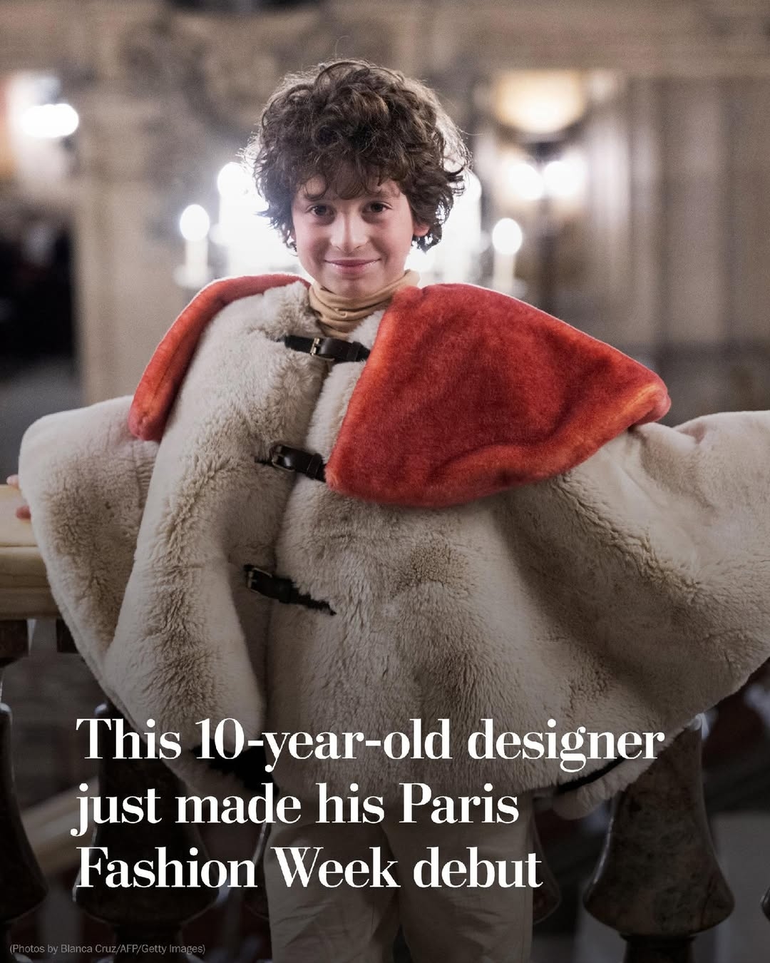 不曉得是忘了喝夢婆湯,還是帶著履歷表轉世?年僅 10 歲的神童小男孩 Max Alexander 自稱「Gucci 轉世」,帶著他的個人品牌 Couture to the Max 正式踏上巴黎時裝週,在巴黎歌劇院金碧輝煌的燈光下,發表了他的 2026-27 秋冬系列,15 套時裝造型全靠品牌剩餘廢料和完成,像是用愛馬仕防塵袋、軍用降落傘製作成訂製服,連影后莎朗史東都曾主動請他訂製外套。
