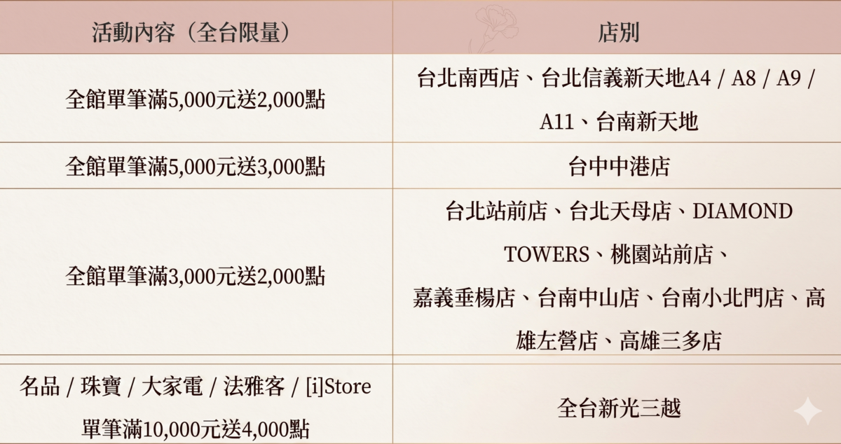 - 【聯名卡友】:刷台新 / 新光三越聯名卡,當日當店單筆滿 10,000 元,贈 2,000 點 skm points。
