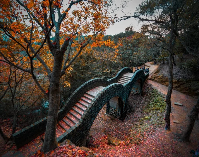 拱北殿是清光緒三十二年(1906年)建造的,是已經擁有百年歷史的古廟。寺廟周圍與後山步道種植了數百棵楓樹,秋天時楓葉轉紅,再加上日式造景會讓人彷彿置身於京都,非常有韻味~ 最熱門的打卡位置——石砌雙拱橋,真的就像古裝日劇會出現的場景啊!