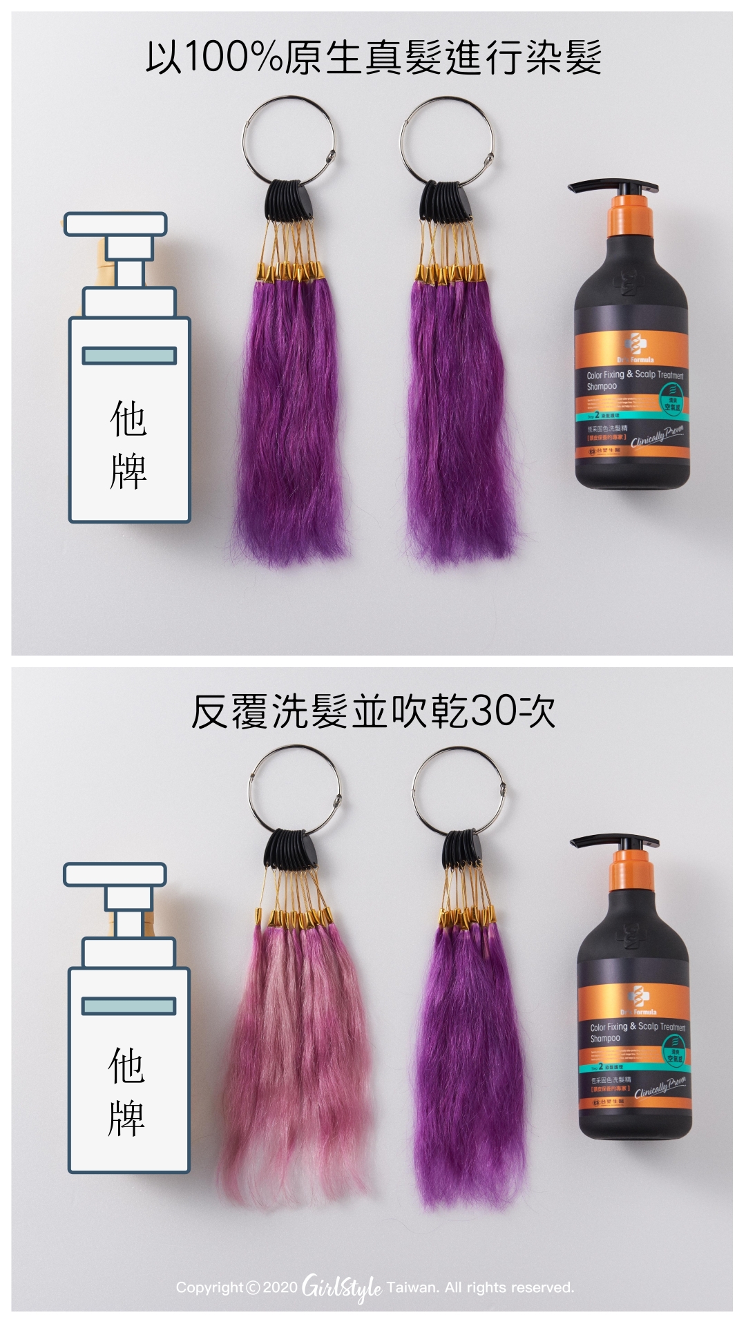 當然,護色力到底好不好,小編實驗後就知道!這次以「清爽空氣感」與市售護色洗髮精進行PK,反覆洗髮(100%原生真髮)再吹乾重複30次後,可以明顯看出他牌髮絲已明顯褪色,而且變得乾燥斷裂;而使用「清爽空氣感」的髮色只有稍微褪去,髮絲依舊維持柔順狀態,可見Dr’s Formula恆采固色洗髮精的護色力真的超強大啦~(也間接替使用者省下不少摳摳?)