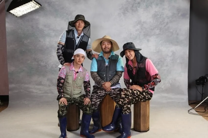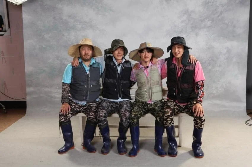 近日,韓網論壇也流出貌似是金宇彬、李光洙、都敬秀(都暻秀)、金基邦一起為綜藝拍攝的合照,照片中四人頭戴斗笠與漁夫帽、穿著土味背心夾克,還有碎花袖套與花褲,最後搭配一雙長雨靴,完美變身Local農夫!這要是走在鄉間路上根本沒有人認得出來吧XD