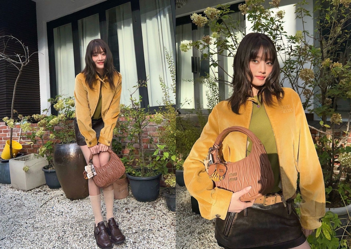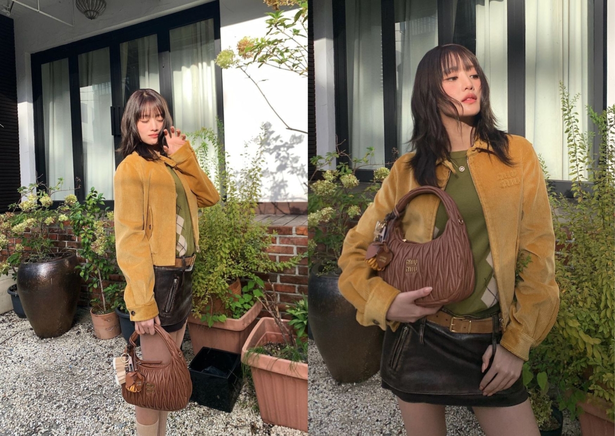 Minnie 在前往巴黎時裝周現場時,選擇 Miu Miu 黃色麂皮夾克、墨綠色針織毛衣和咖啡色皮革短裙,腰間繫上一條淺棕色皮帶做出區隔、拉長身高與腿長的比例,腳上搭配駝色中長襪和樂福鞋,手拿 Wander Matelassé 納帕軟皮半月形手袋,全身大地色系融合撞色設計,入秋感十足。