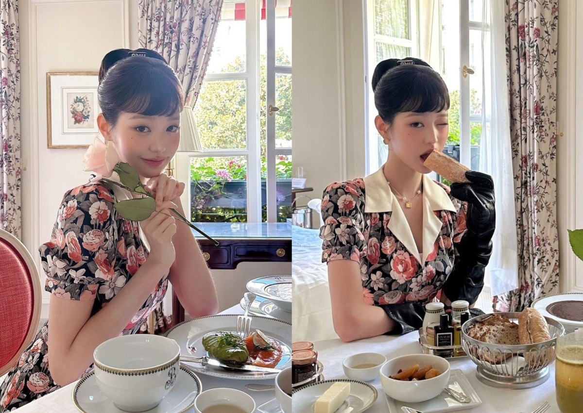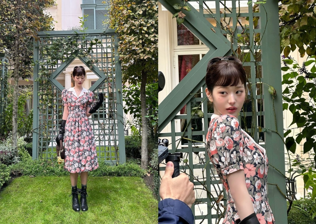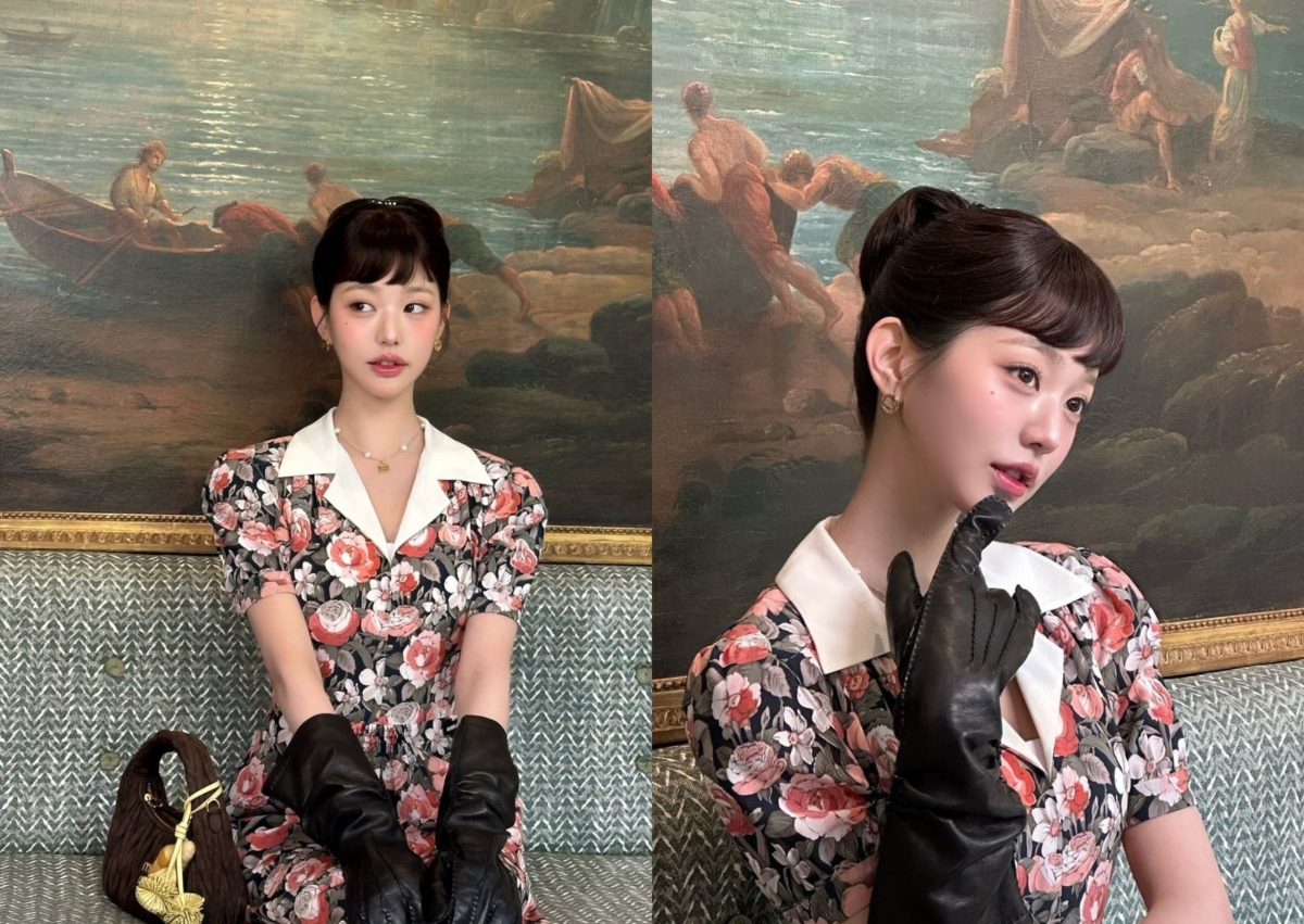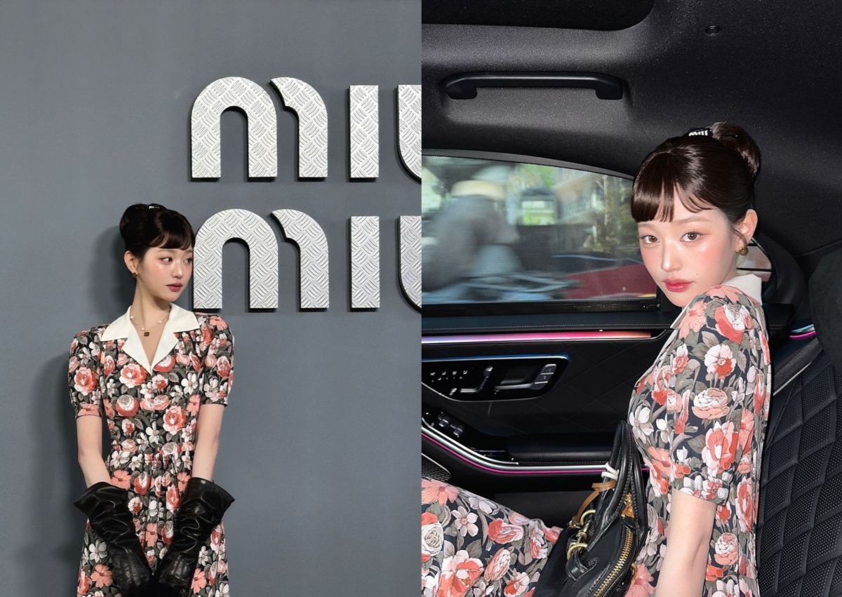 張員瑛出席 Miu Miu 2025 春夏時裝大秀時,身穿花卉連身洋裝,袖籠以公主袖造型為設計,白色翻領製造層次感,黑色手套則是畫龍點睛的點綴,呼應黑色靴子,綁起乾淨的優雅包頭、加上瀏海,復古味十足。站在一大片草原上、喝咖啡和抹吐司,真的宛如從歐洲莊園裡走出來的浪漫公主!