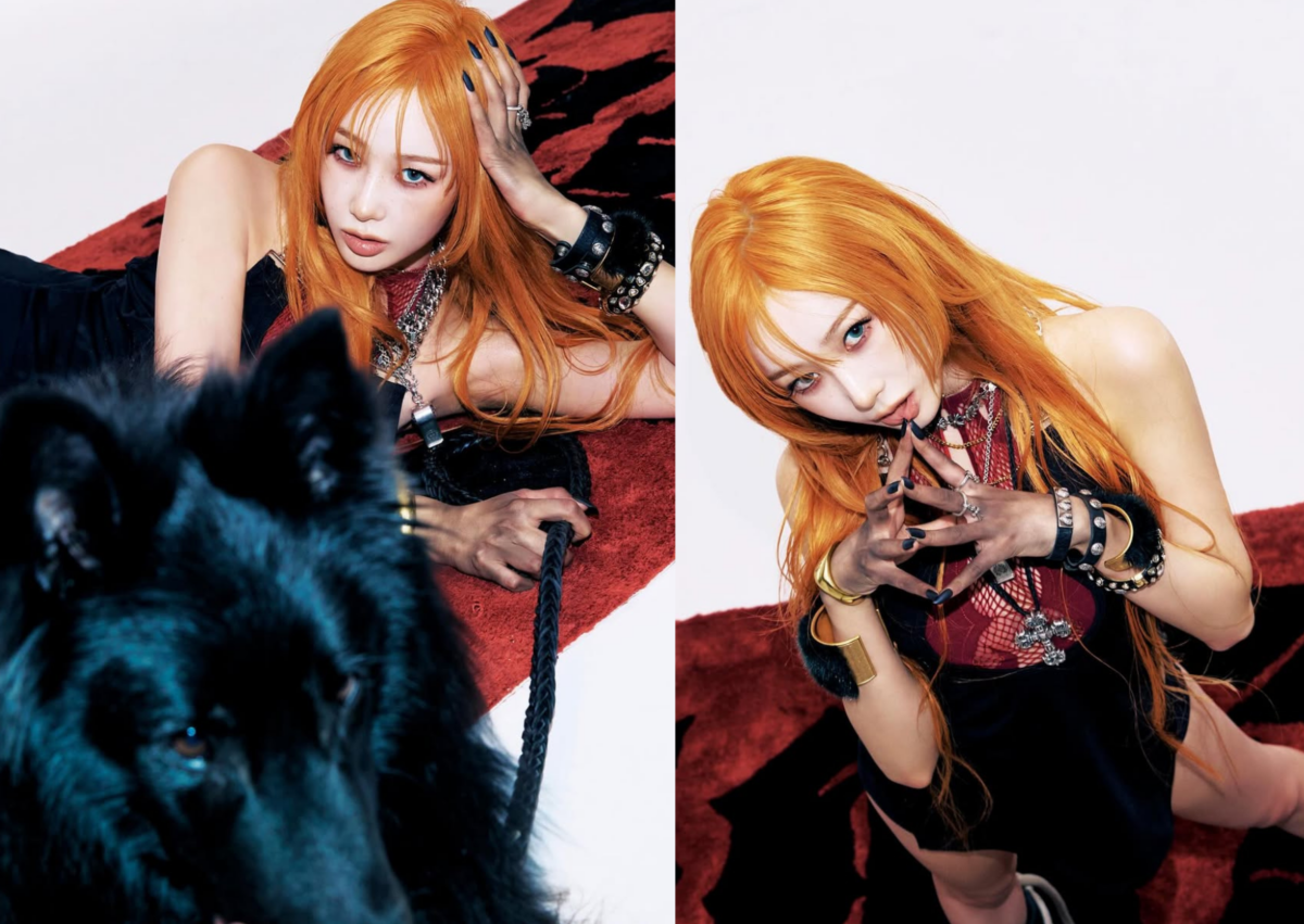 最辣媽咪 Giselle 依舊不失火辣性感程度,選擇一件黑色連身裙亮相,繞脖和背後挖空的細節滿滿,胸前則以紅色網狀面料堆疊,配件上則以皮革、金屬感鏈條為主,拍攝時甚至一旁還有拉風的黑色狗狗陪襯,超有霸氣氣場。