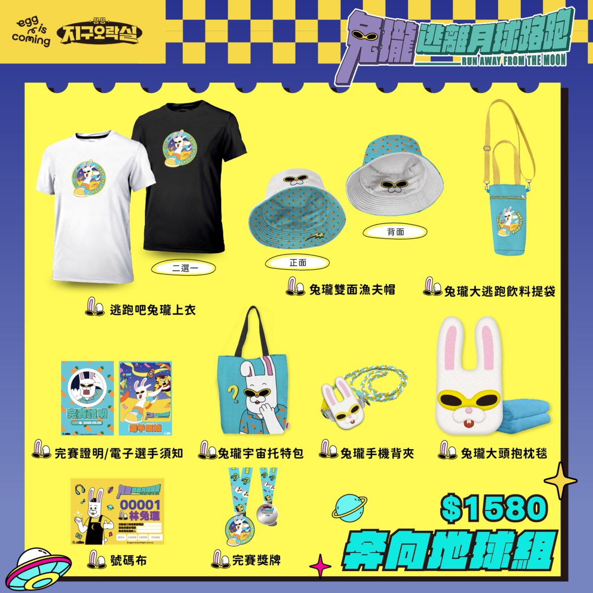 報名路跑還可以拿到超級搞怪可愛的兔瓏物資周邊商品!這次設計以「月球大逃亡」為概念,兩大組別分別為「逃離月球組」與「奔向地球組」, 包含「逃跑吧兔瓏上衣」、「兔瓏雙面漁夫帽」、「兔瓏大頭抱枕毯」、「兔瓏手機背夾」、「兔瓏宇宙托特包」、「兔瓏大逃跑飲料提袋」、「獎牌」、「完賽證書」等等在不同組合中,每樣物資實用又充滿浮誇魅力,讓粉絲在日常生活中也能持續被兔瓏療癒~