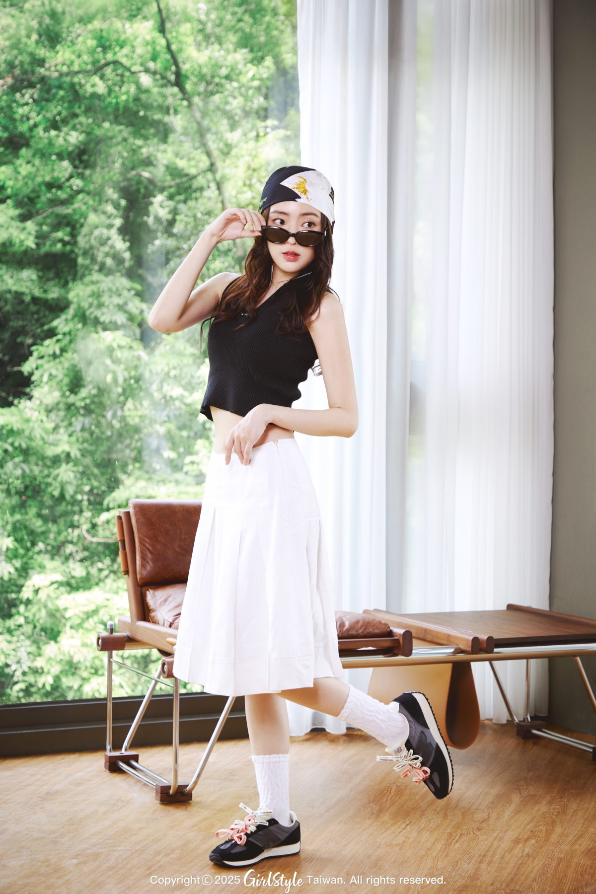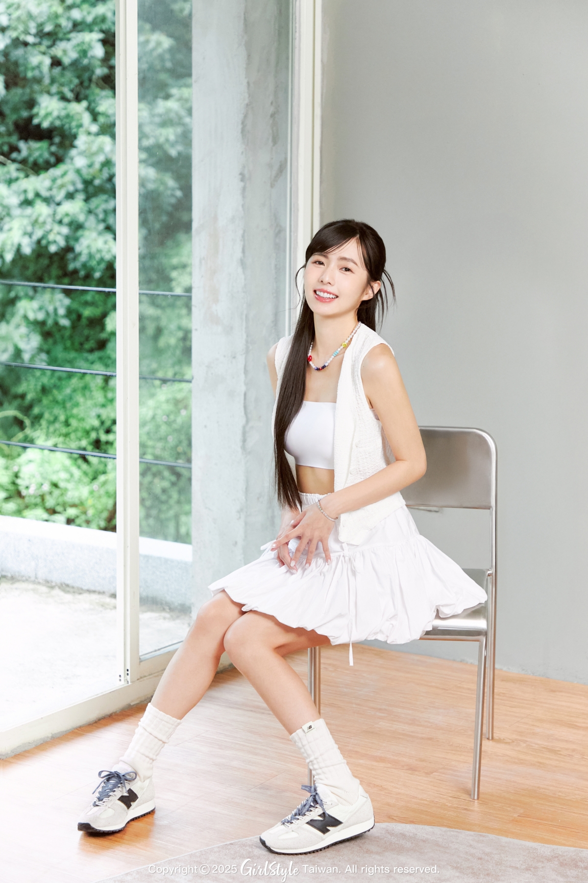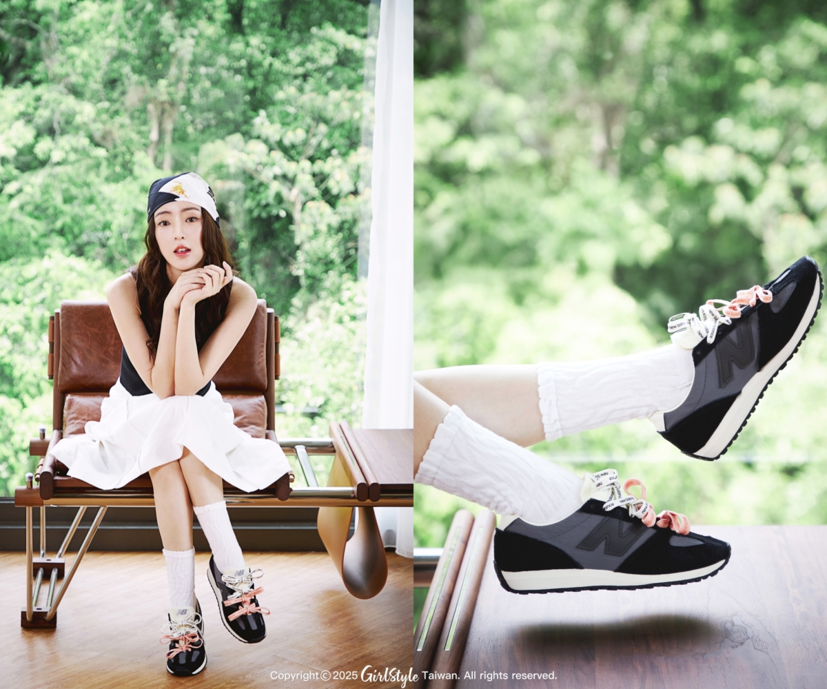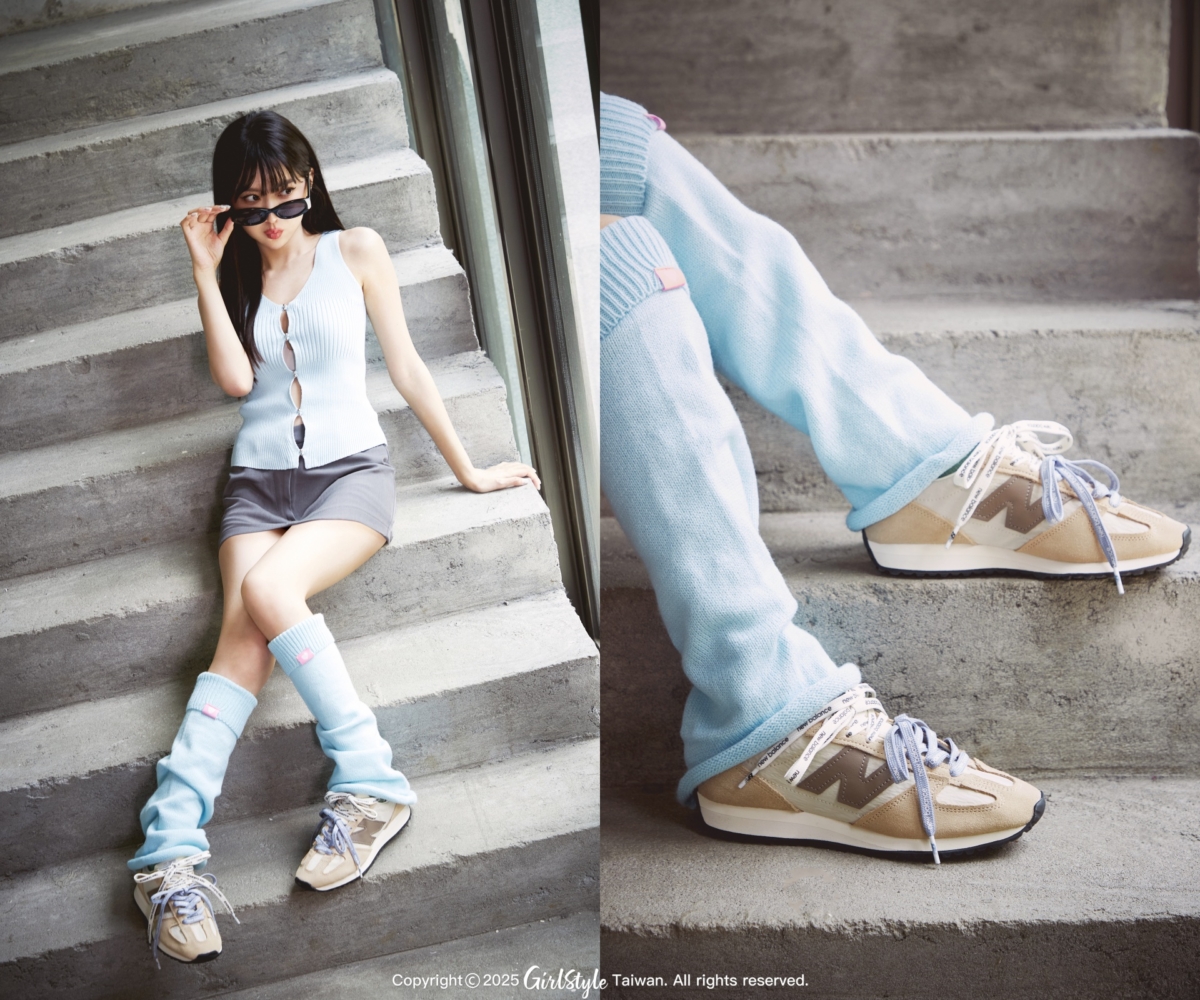 鞋款則選穿曦光白 471,以極簡色調襯托整體清新風格,而最吸睛的亮點,莫過於交錯的藍白雙色鞋帶,彷彿是冰川與雲朵交織的線條,低調卻藏著個性巧思,讓視覺重點自然集中到足下。整體穿搭風格甜而不膩,溫柔又不失存在感,是這季許多女孩追求的輕甜風格靈感!