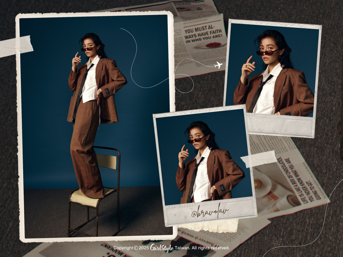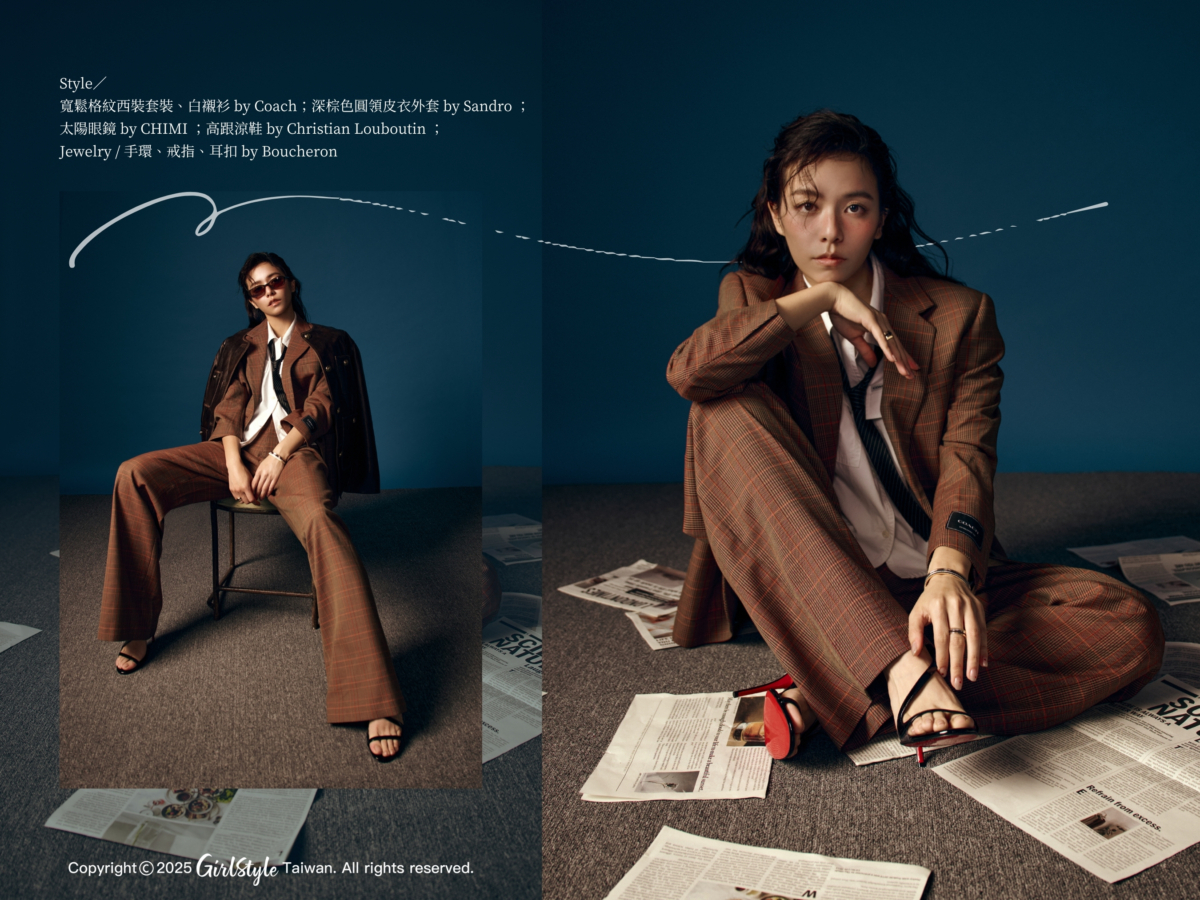 這套復古紳士造型以 Coach 寬鬆格紋西裝套裝、白襯衫為主,繫上領帶多了一份正式不羈感,加上一件 Sandro 深棕色圓領皮衣外套、 CHIMI 太陽眼鏡以及 Christian Louboutin 高跟涼鞋,復古的同時更注入一絲女人味,傳達追求內心自由的精神,適合表達放空自我與追尋心靈平靜的心境,顯示出在異國求學的人生全新摸索階段,最後戴上 Boucheron 珠寶點綴,「我在30歲時為自己多打了兩個耳洞,所以現在對於耳環的搭配上特別有興趣,也有更多選擇。」