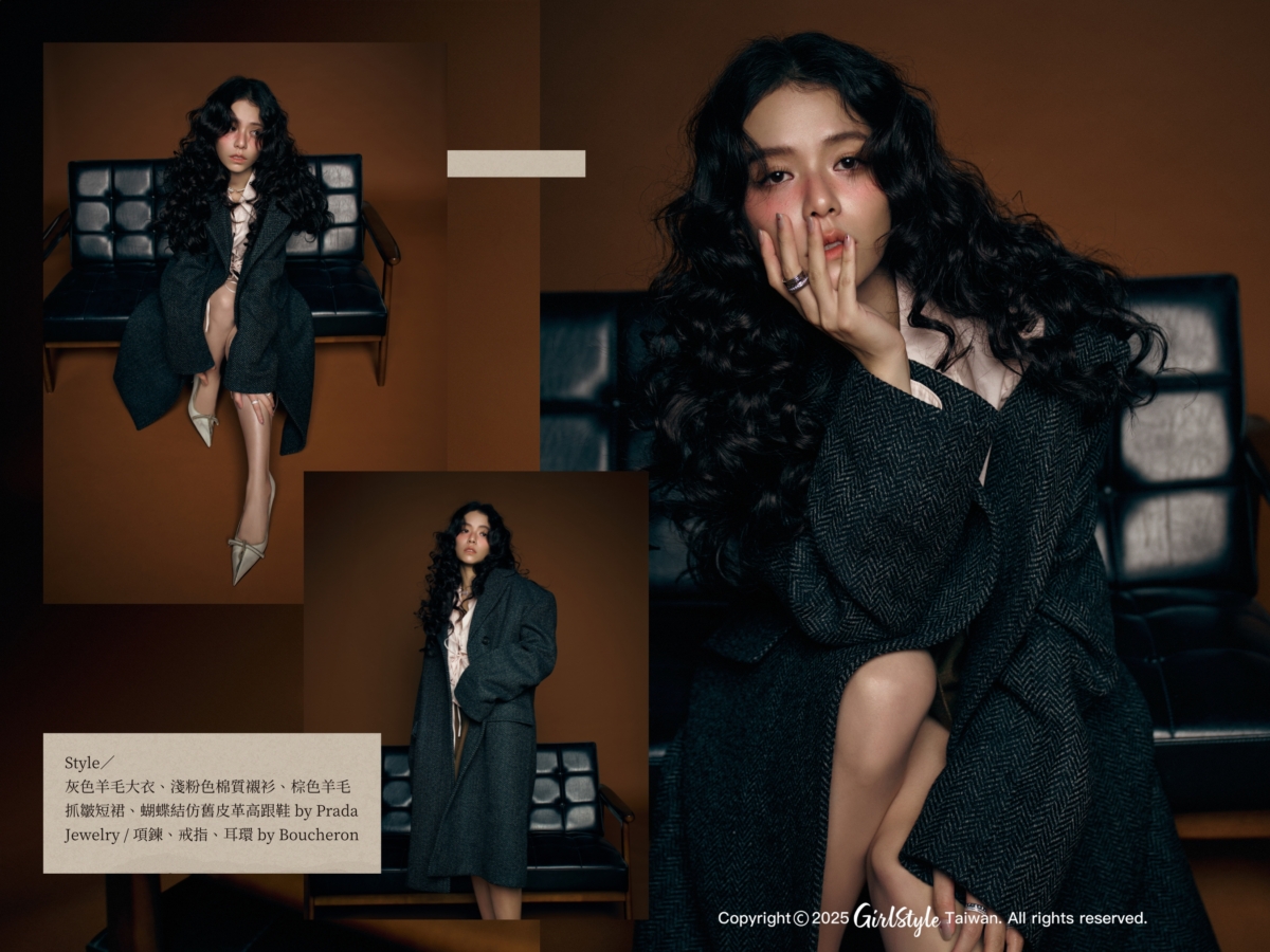 這套選擇 Prada 灰色羊毛大衣、淺粉色棉質襯衫、棕色羊毛抓皺短裙和蝴蝶結仿舊皮革高跟鞋,項鍊、戒指、耳環都來自 Boucheron。服裝上以顏色對比、剪裁感展現出熱情與力量,強烈的個性與獨立態度,體現出狂野奔放的自信魅力。「我私服以前幾乎都是黑白灰、各種深色系,原本我覺得自己應該適合簡約的風格,但是去了國外之後才發現,可以感受到每一個人都是很有自信的展示自己的樣貌,會讓你覺得每個人真的都是獨立的個體、展現自己的特色,而不是追求一致性、標準化的審美。」